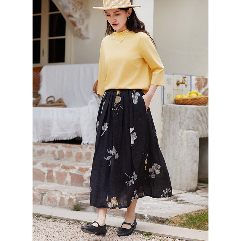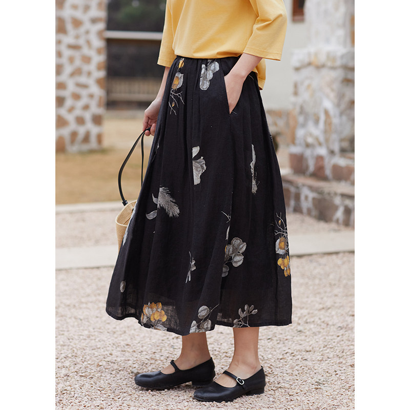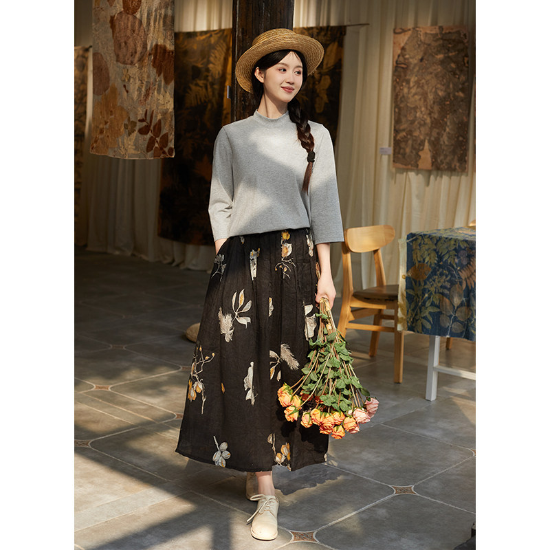忘城Y660座 春季 21支亚麻黑色定制印花中长款 a字半身裙女 春风渡