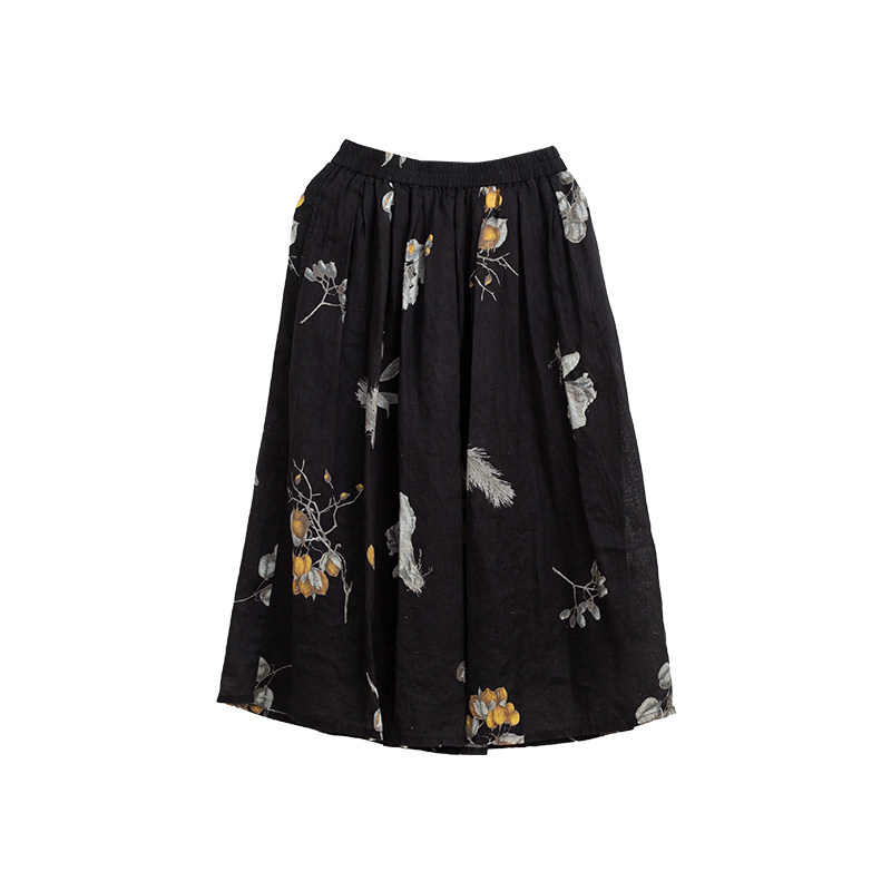 忘城Y660座 春季 21支亚麻黑色定制印花中长款 a字半身裙女 春风渡由