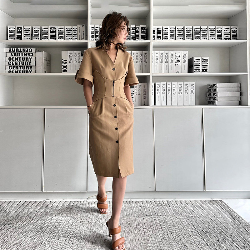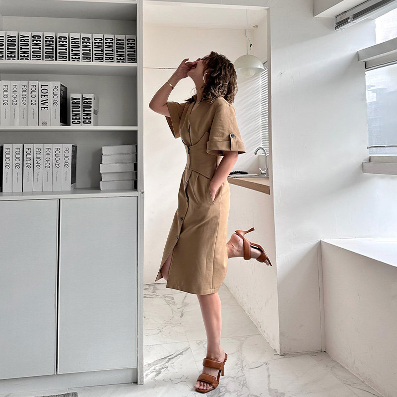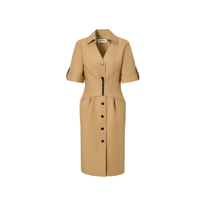 LEDIM 小众设计高级感衬衣裙X形结构腰封 WANG卡其色V领连衣裙女款