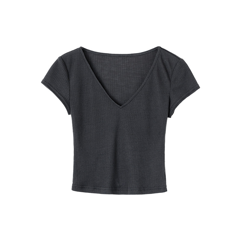 韩雨嘉 莱赛尔天丝罗纹v领短袖 T恤女夏短款 纯欲上衣 夏日清凉感