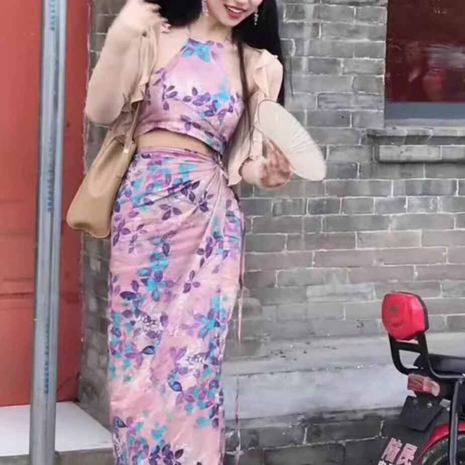 甜美度假风碎花吊带连衣裙女夏日穿搭开衫 两件套 异域公主 织物猪