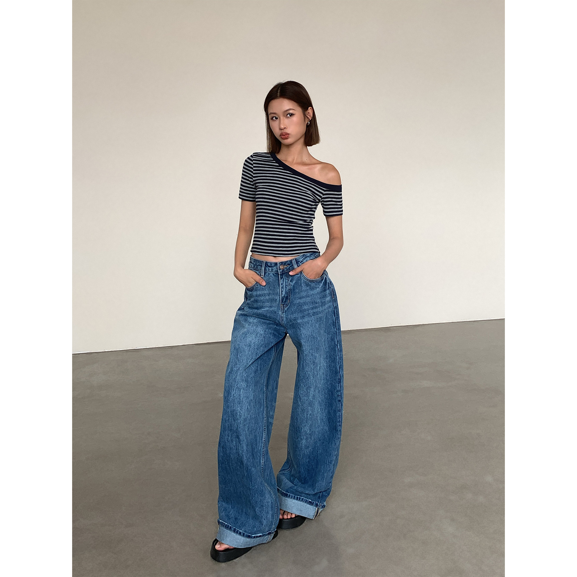 女低腰美式 ousph 现货5折 蓝色直筒牛仔裤 高街宽松阔腿休闲长裤由