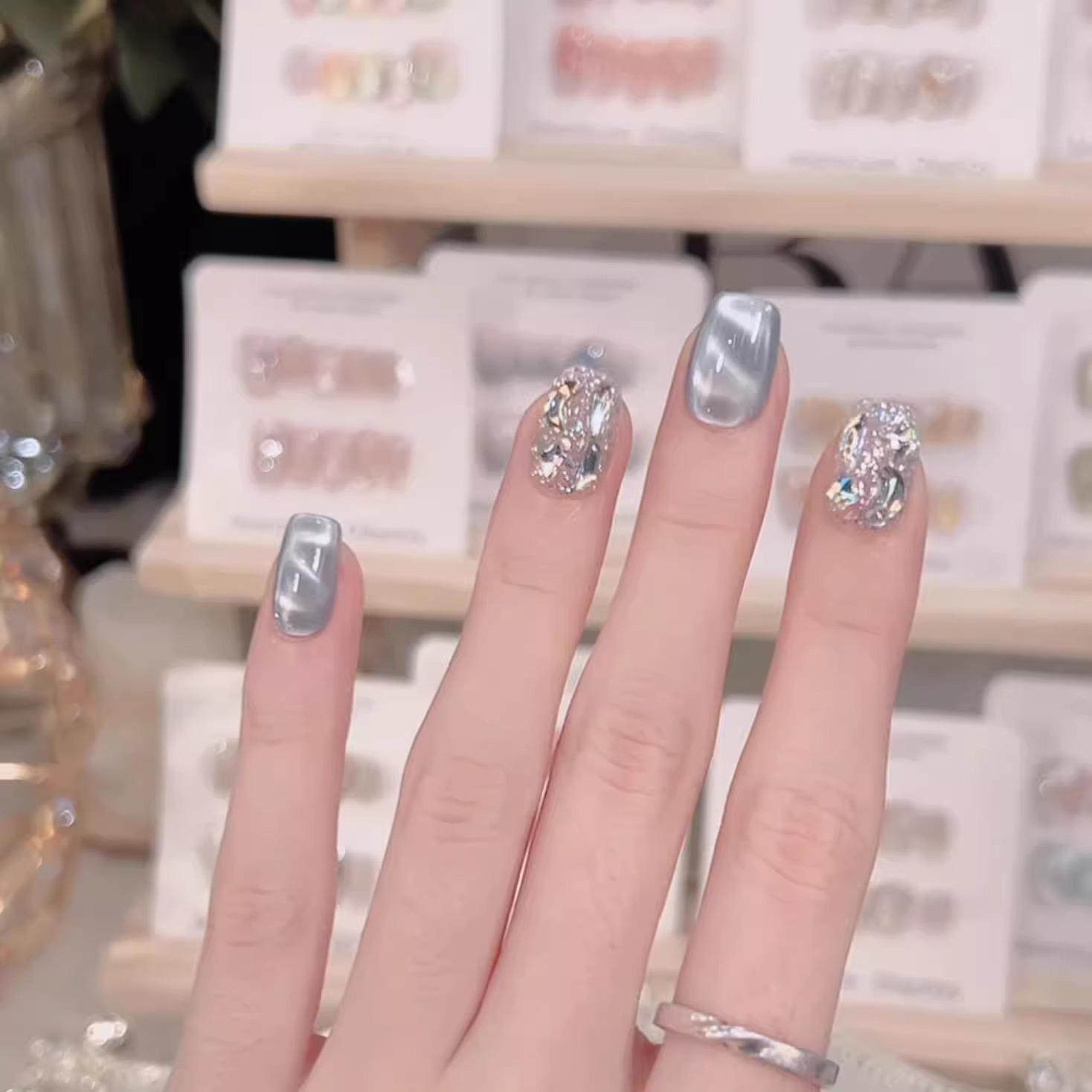 猫眼纯手工穿戴甲高级感假指甲贴美甲贴片 纯手工穿戴甲水波纹短款