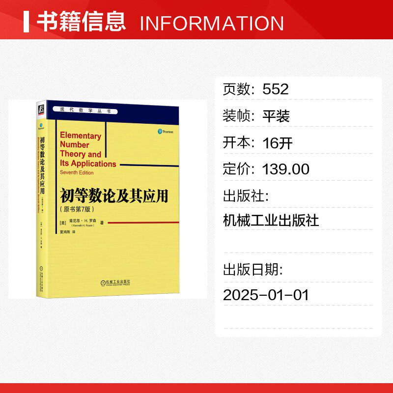 为您提供商品初等数论及其应用 夏鸿刚 机械工业出版 97871117677 H.Rosen 美 社 肯尼思·H.罗森 原书第7版 著 Kenneth 包邮 译 新华正版的详细介绍,