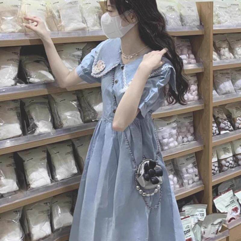 大码 蓝色连衣裙女夏季 胖mm2 300斤娃娃领收腰温柔长裙子 茶歇法式