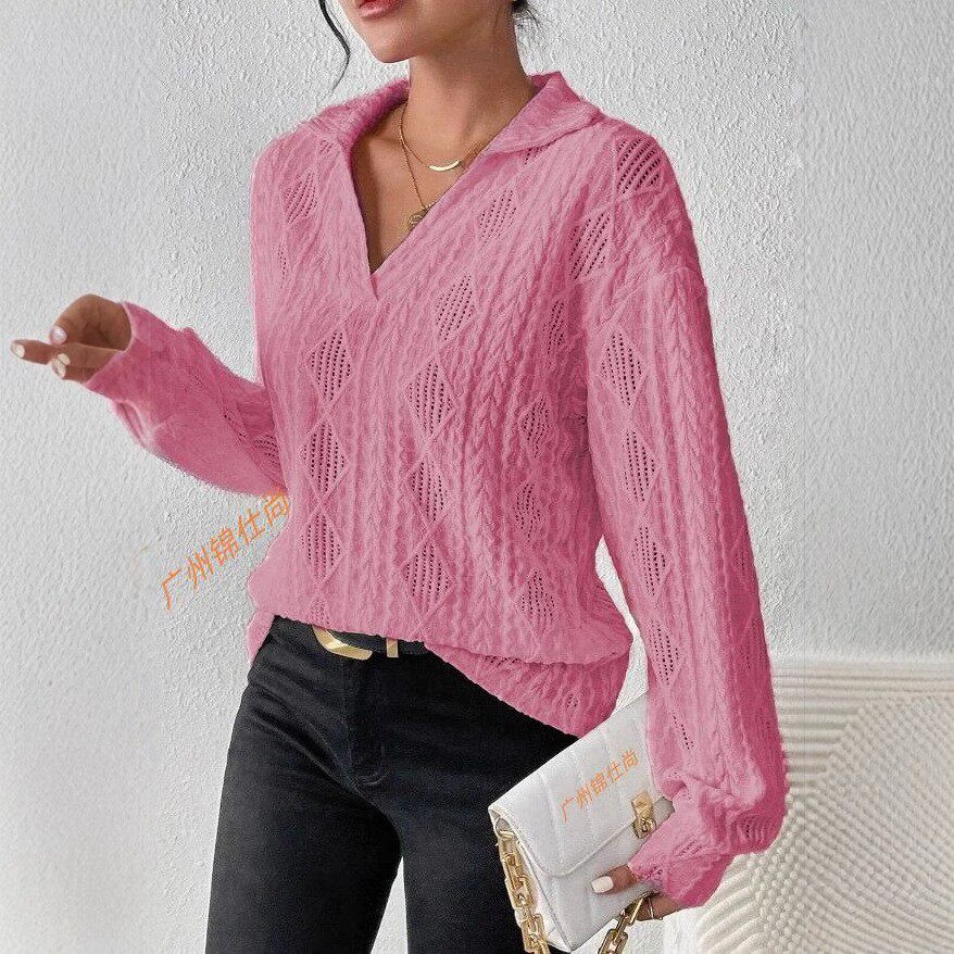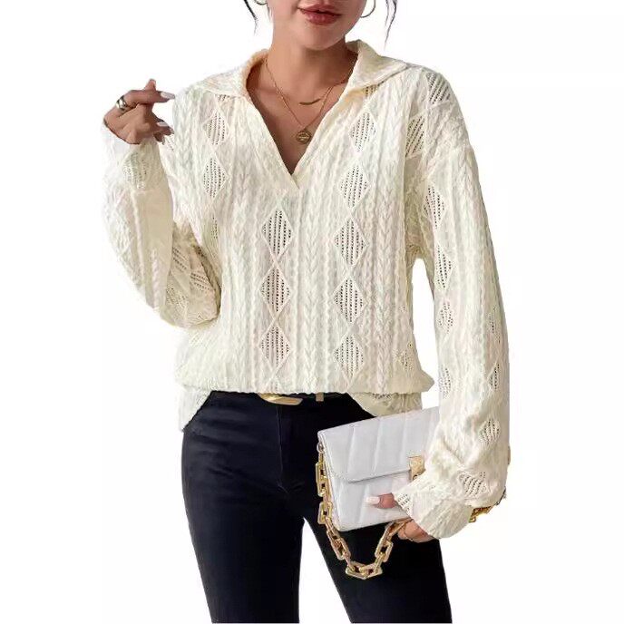 women blouse T恤女 shirts sleeved long 镂空翻领休闲长袖
