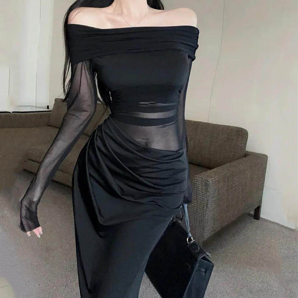 网纱一字肩镂空黑色连衣裙轻奢气质性感辣妹礼服长裙 小可wiwi法式