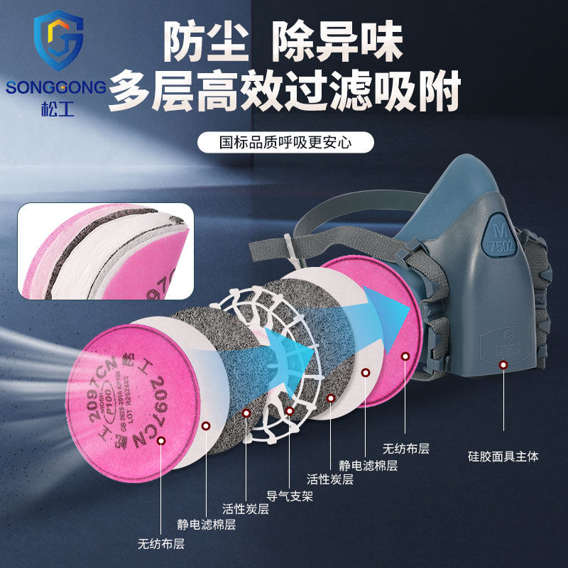 松工7502硅胶防尘口罩2097活性炭滤棉电焊防烟KP100煤矿工业粉尘由