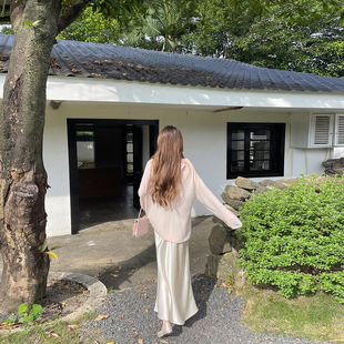 粉色天丝冰凉轻薄针织防晒罩衫 上衣 女夏高级感宽松慵懒圆领长袖由