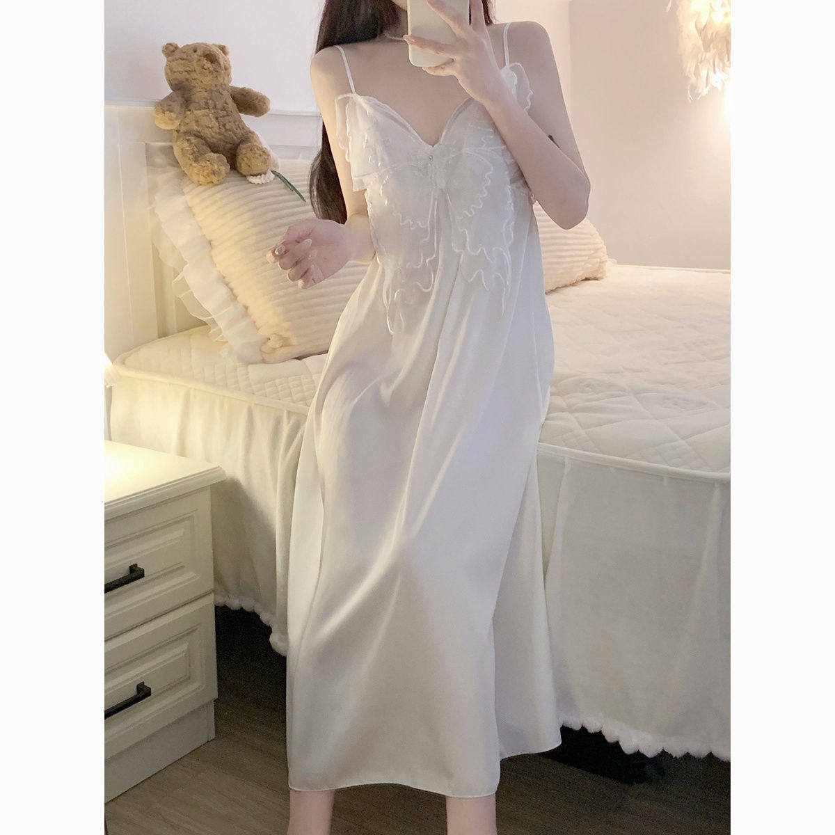 带胸垫冰丝蝴蝶结蕾丝吊带白色亲肤睡衣家居服 性感睡裙女2025新款