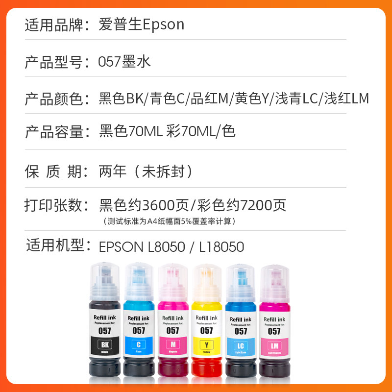 为您提供商品墨仓式 适用爱普生057墨水epson L8050 L18050染料墨水多功能一体式 六色照片不褪色防光耐晒颜料墨水非原装的详细介绍,