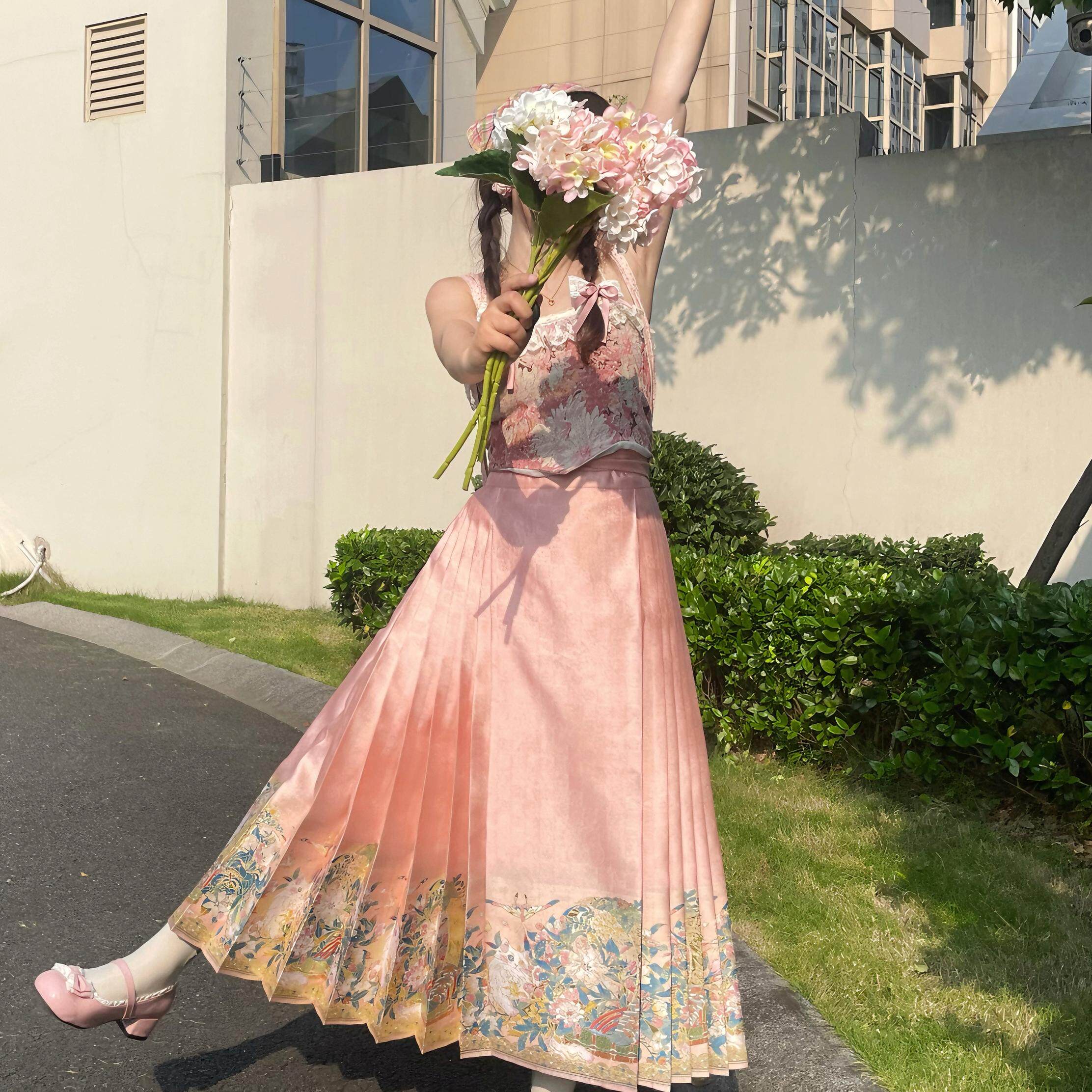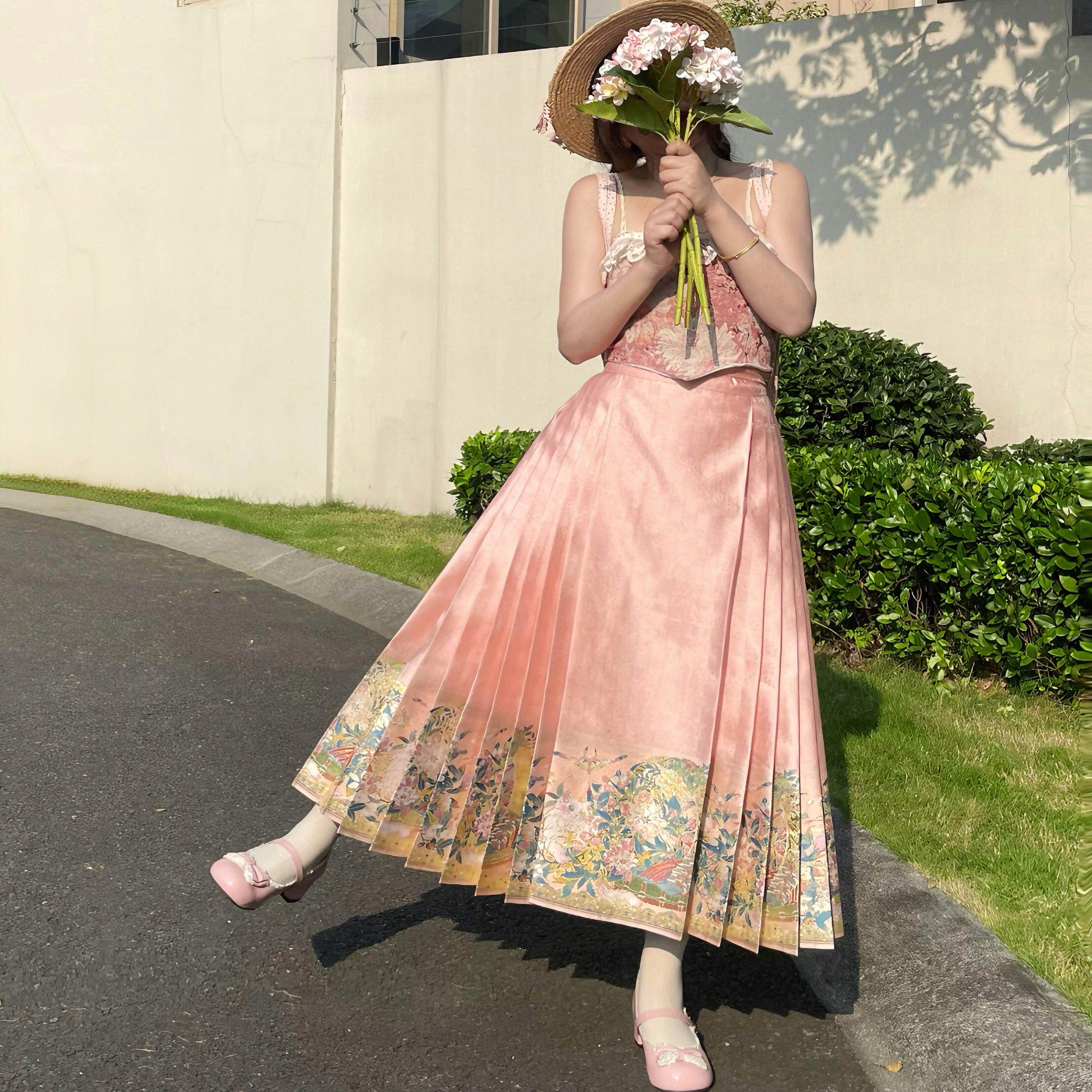 原创汉服女日常一片式 暗袖 盈香 小毛桃 半身裙 宋制百褶裙春夏款