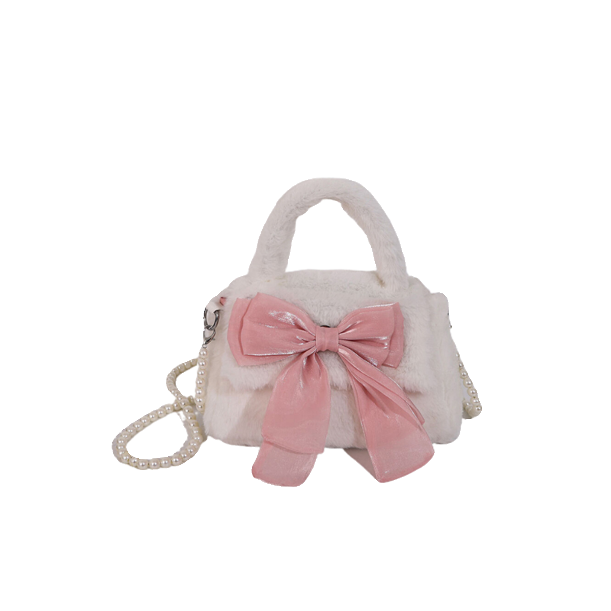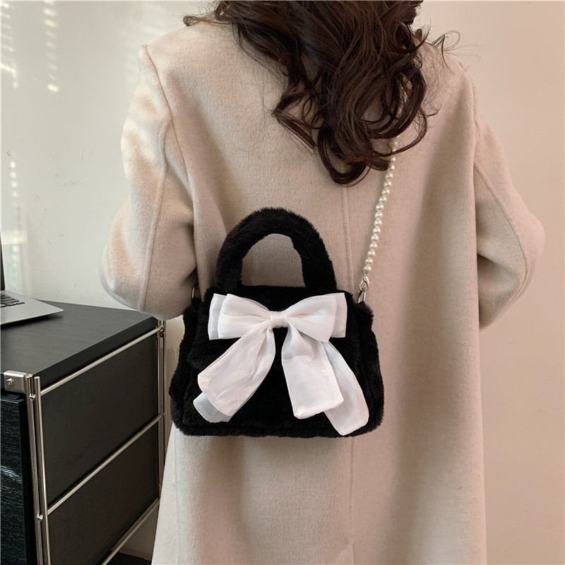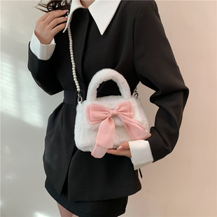 可爱蝴蝶结手提包包女2023冬季 慵懒毛绒毛茸茸串珠单肩斜挎包 新款
