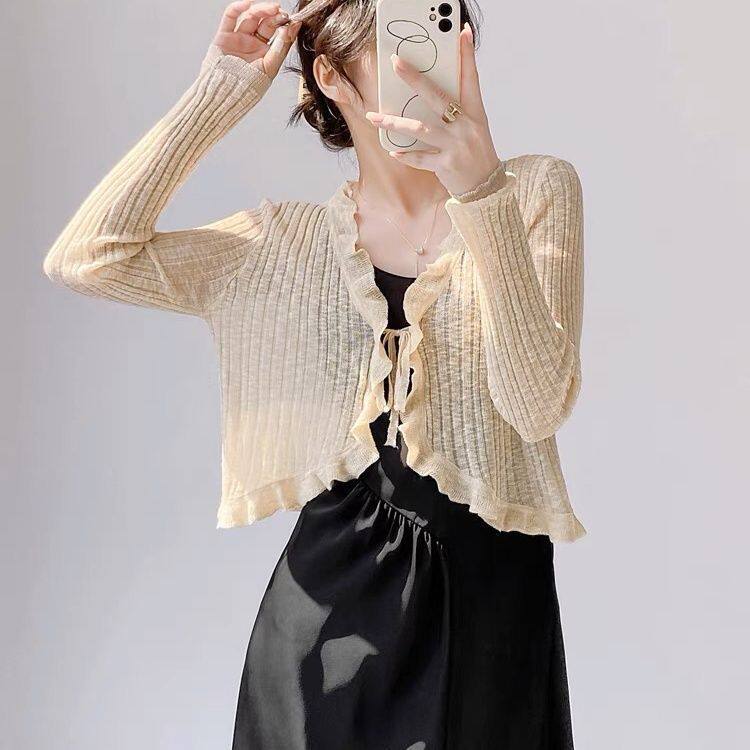 坎肩防晒衫 夏季 披肩外搭宽松上衣 女木耳边绑带短款 开衫 超薄款 长袖