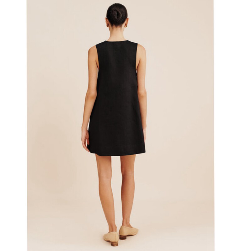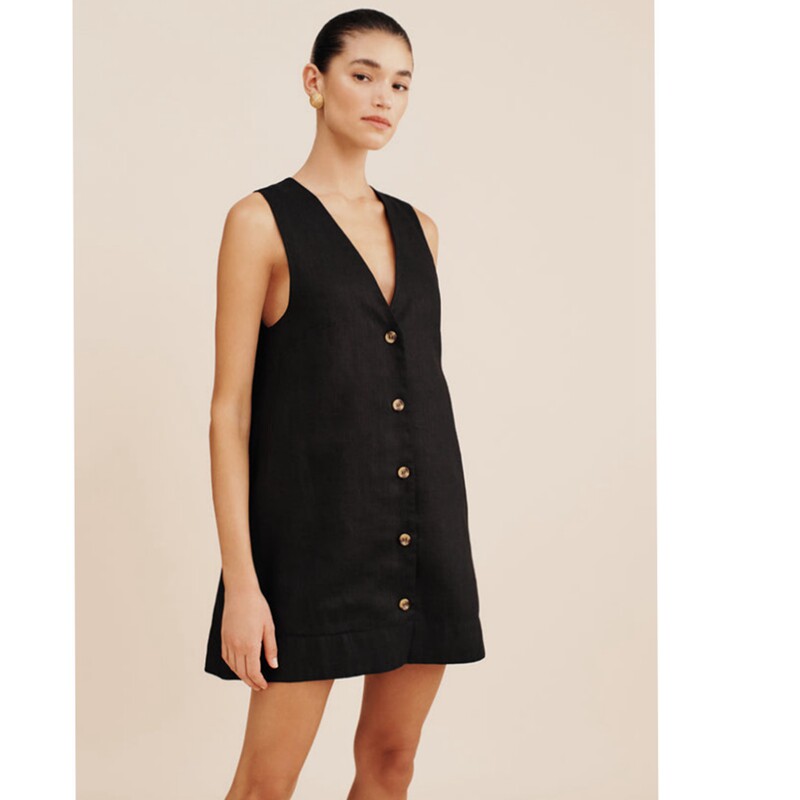 简约百搭短裙女 澳洲小众posse黑色v领亚麻连衣裙复古静奢风无袖
