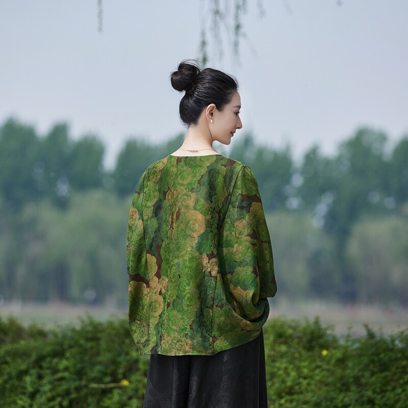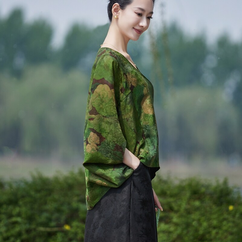 V领 100%桑蚕丝香云纱提花缎 绿祥云 上衣 时尚 款 蝙蝠袖