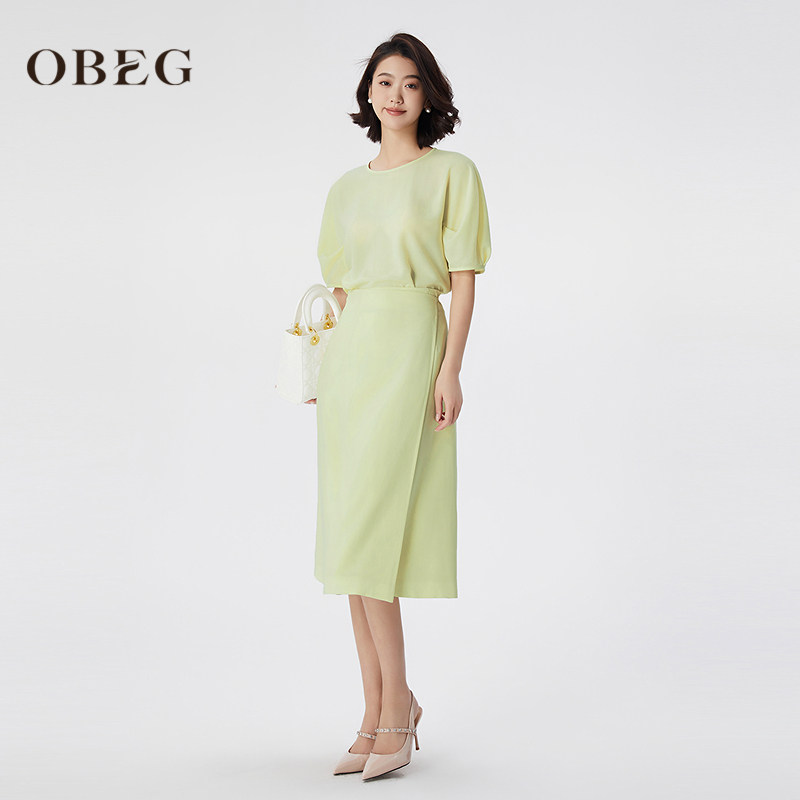 OBEG欧碧倩醋酸系带淡人系半身裙女夏优雅知性裹裙中长裙10482099由