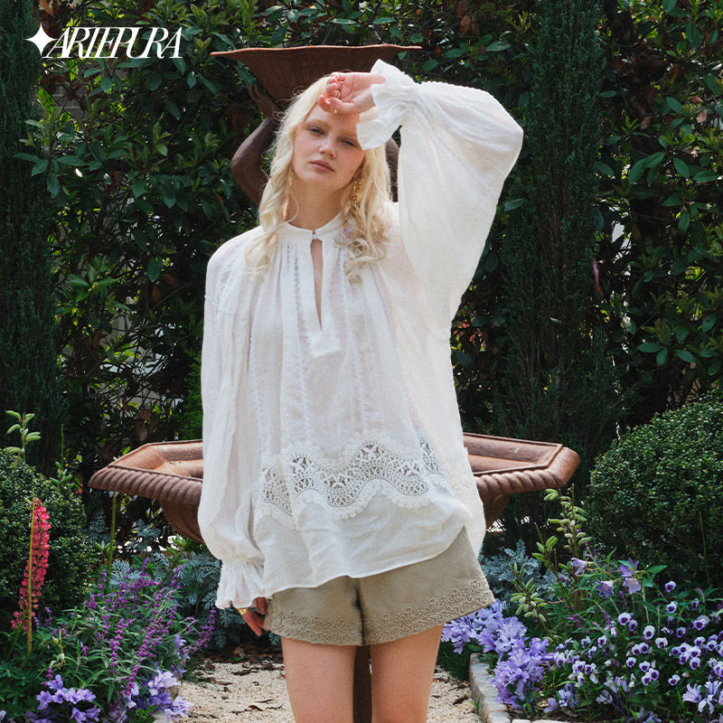 女原创设计宽松休闲通勤长袖 衬衣 PURA白色苎麻花边镂空衬衫 ARTE