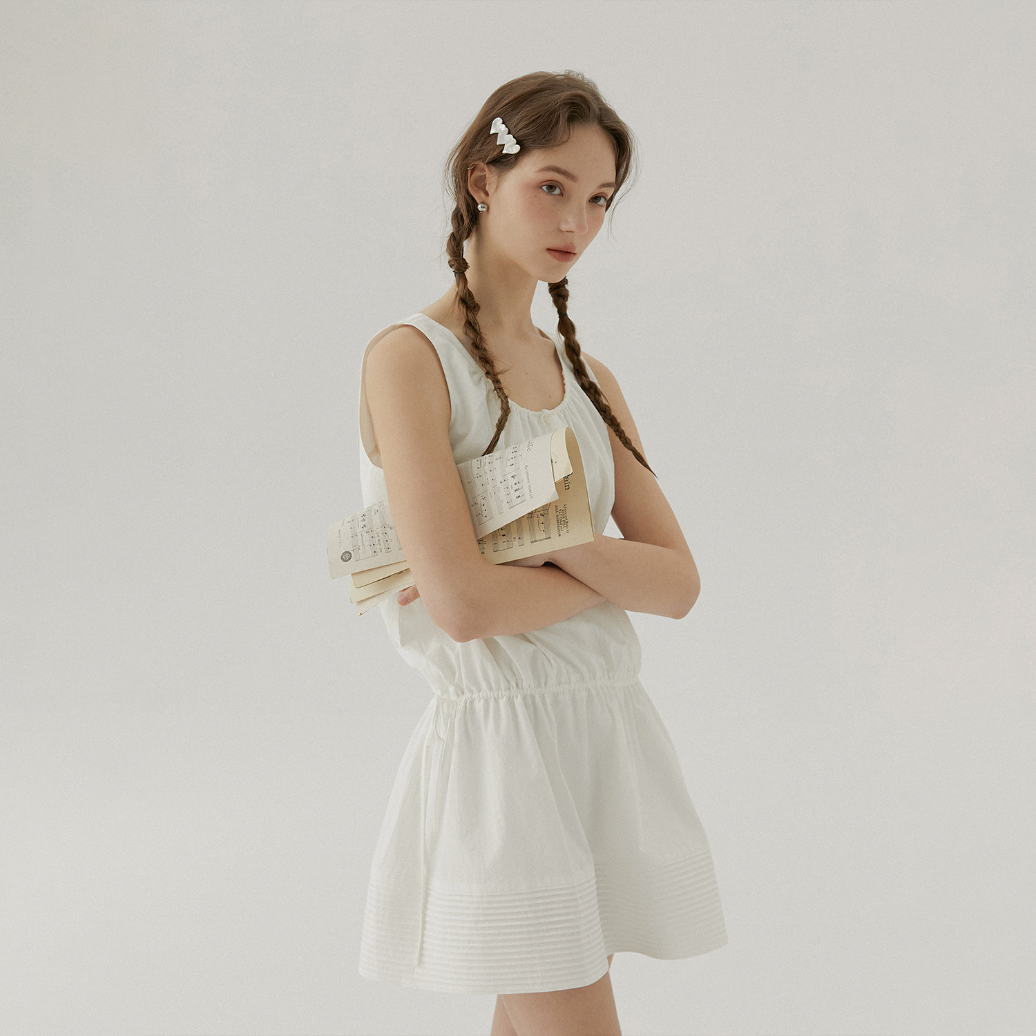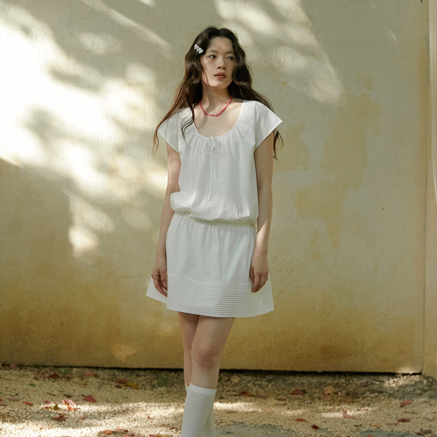 LLANO牙签褶抽绳收腰背心短袖 短裙女夏 连衣裙复古风琴褶俏皮法式
