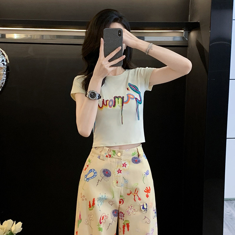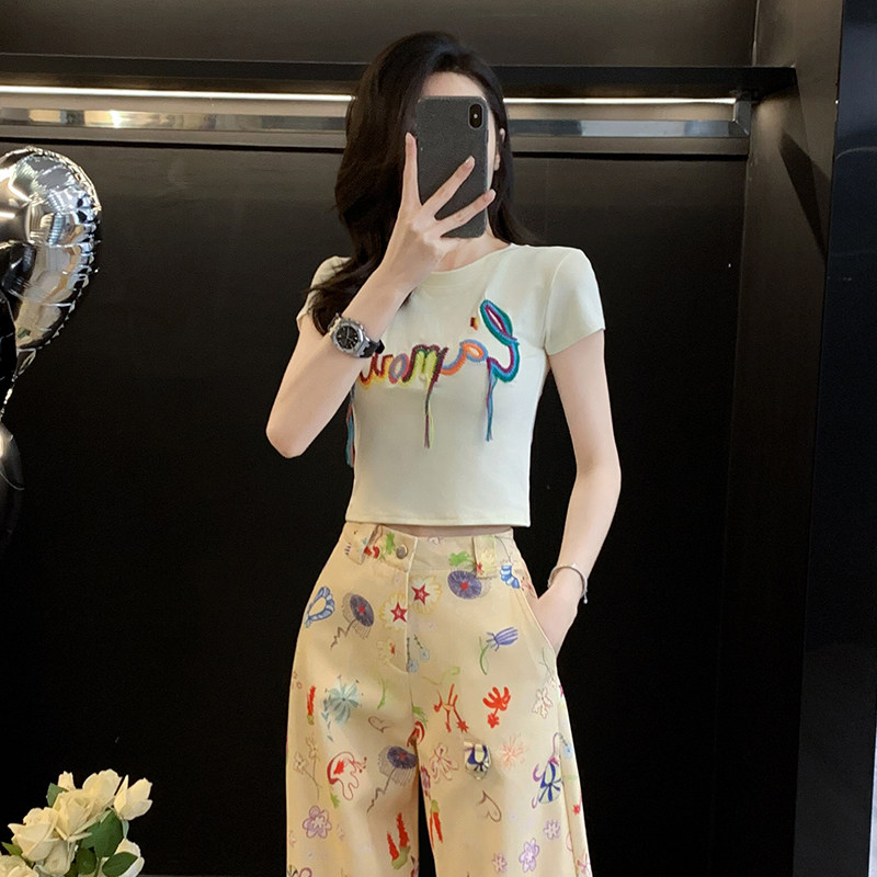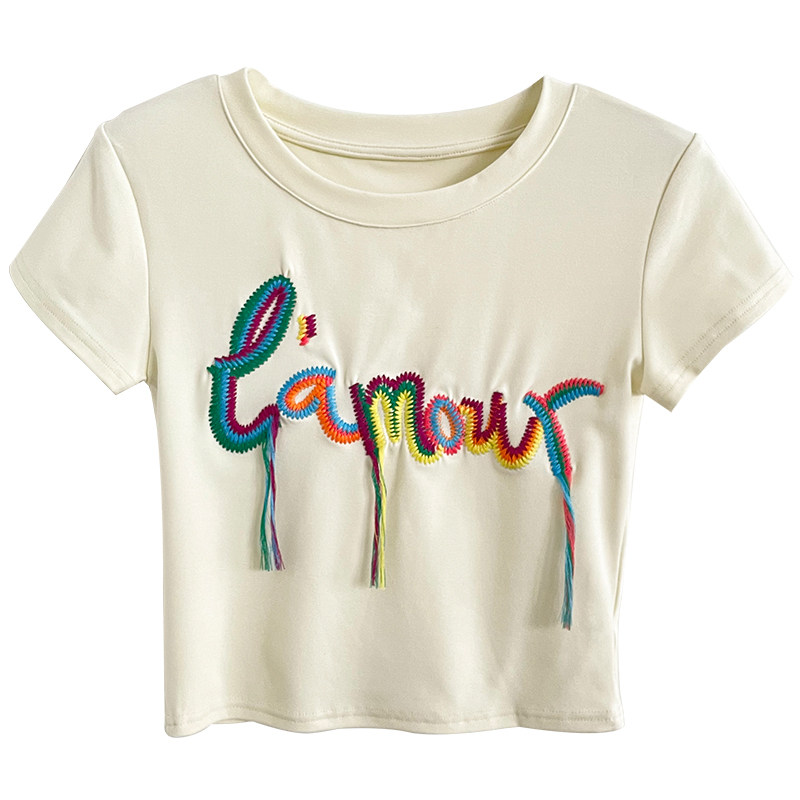 新款 t恤女夏季 紧身短袖 上衣潮 显瘦半袖 衫 设计感修身 刺绣字母短款