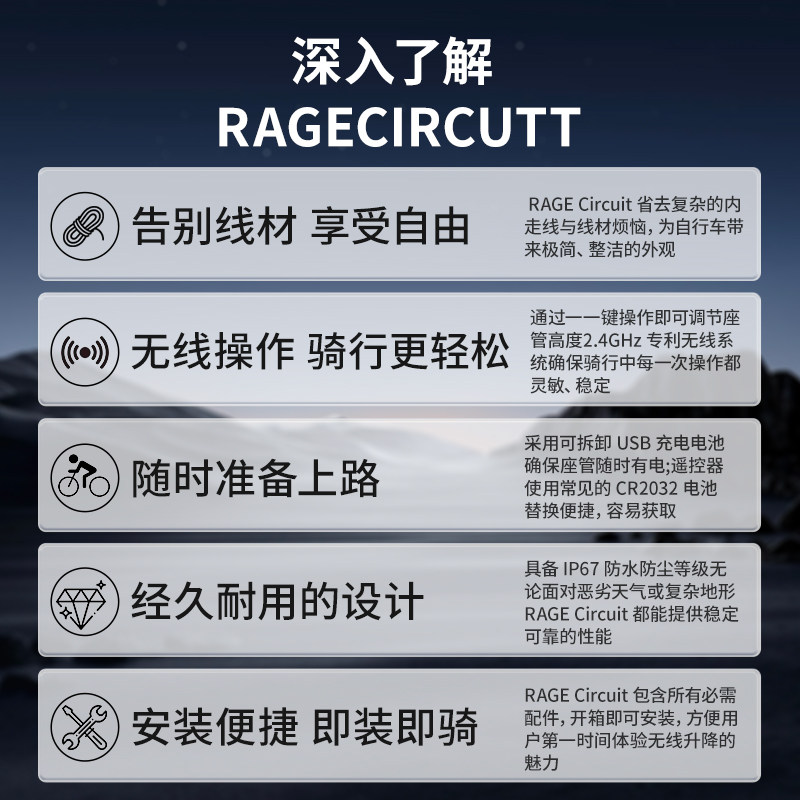 为您提供商品circuit山地车 电控越野升降坐杆 无线电子升降座管rage的详细介绍,