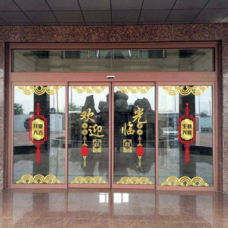 欢迎光临开业大吉墙贴纸餐厅饭店玻璃门商场店铺中国风推拉门贴画