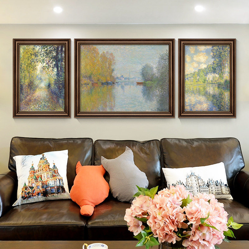 饰画莫奈风景油画沙发背景墙挂画三联世界名画欧式 壁画 客厅装 美式由