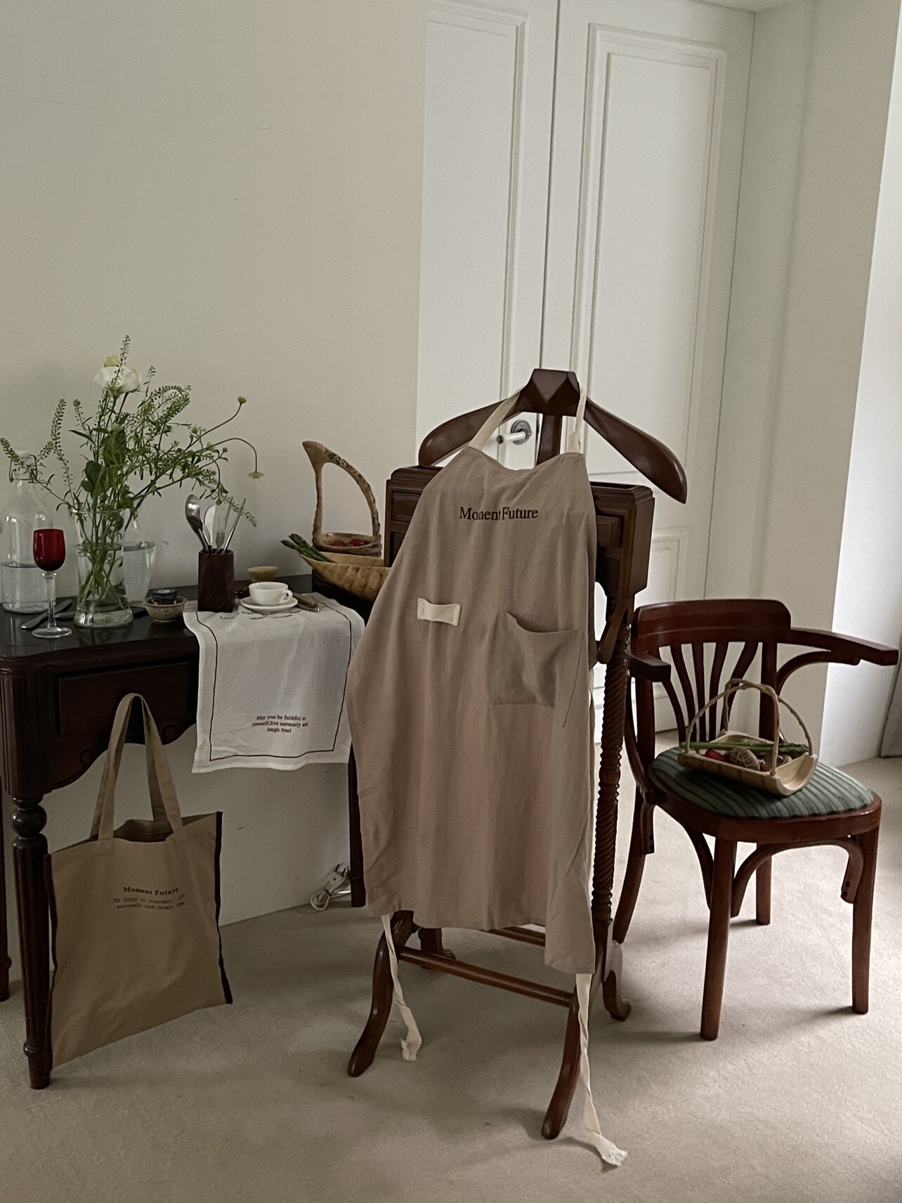 Moment Future韩系ins简约麻棉围裙复古厨房甜品围腰罩衣带口袋款
