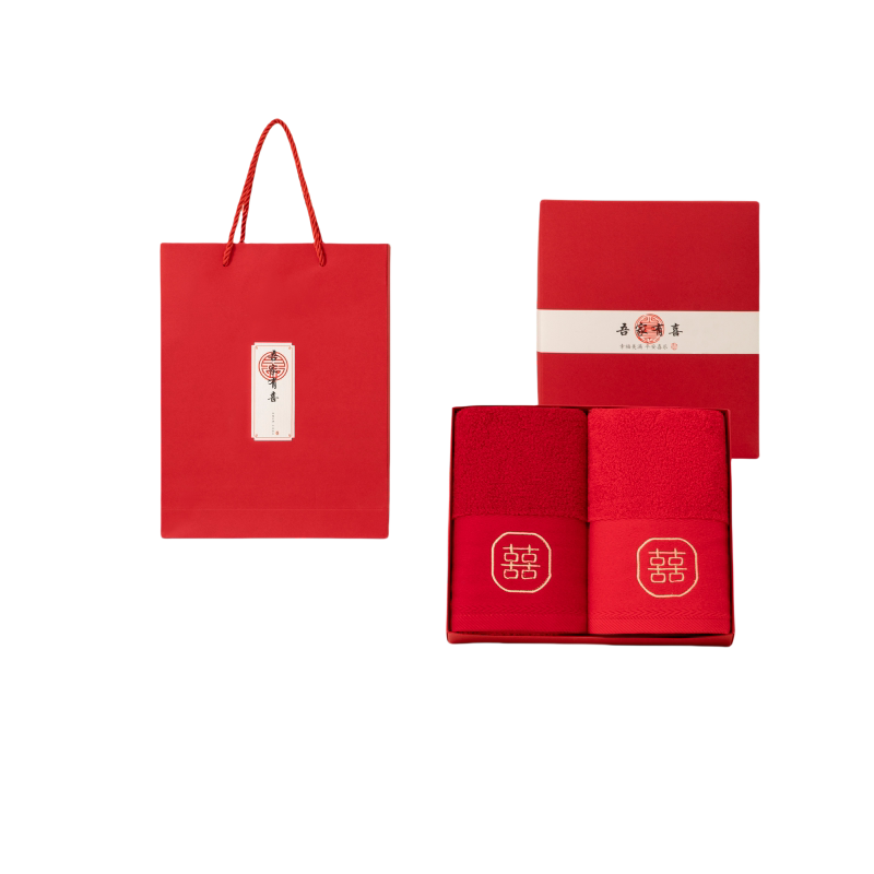 A类母婴级纯棉大红喜字毛巾1对结婚陪嫁礼盒回礼伴手礼西梦家纺