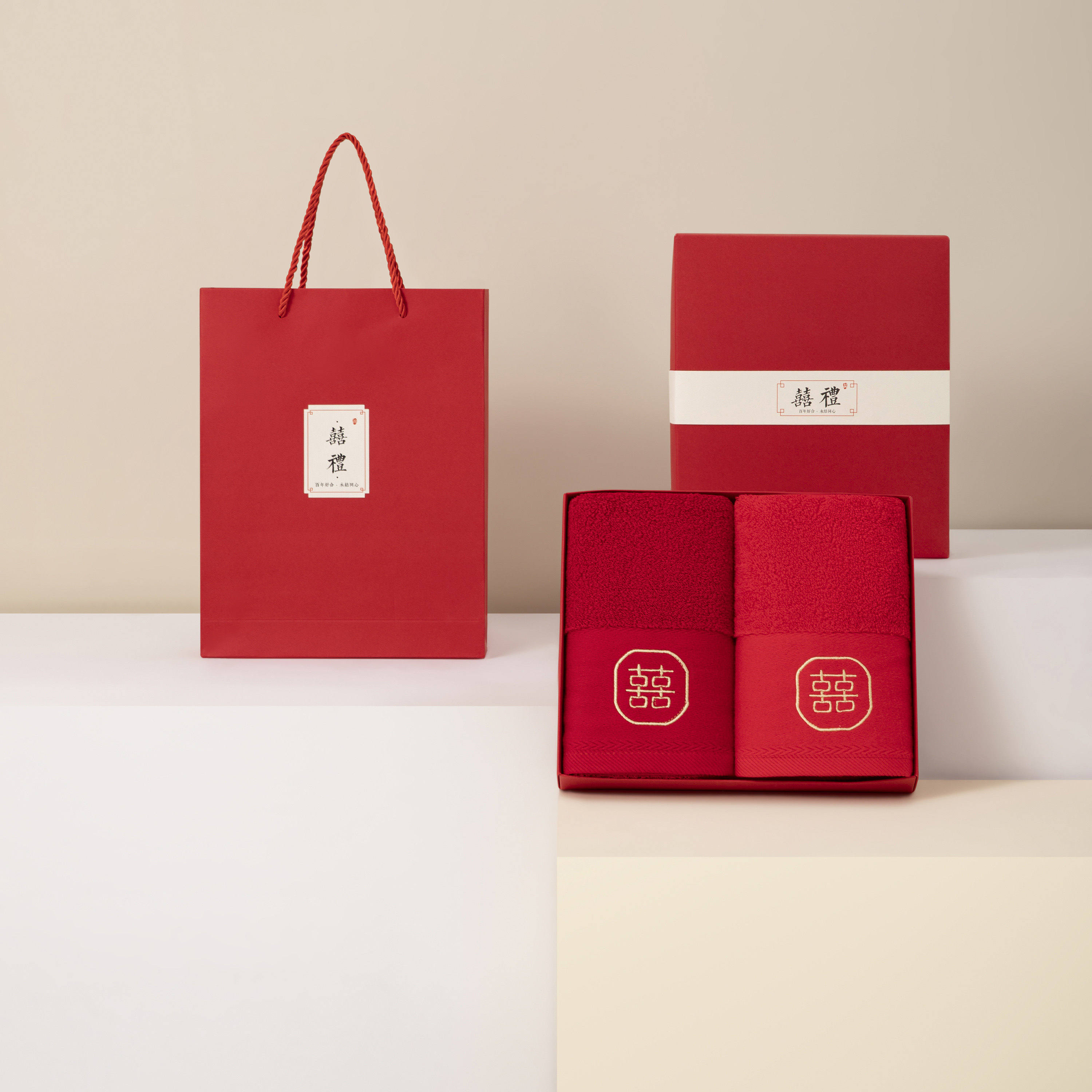 A类母婴级纯棉大红喜字毛巾1对结婚陪嫁礼盒回礼伴手礼西梦家纺由