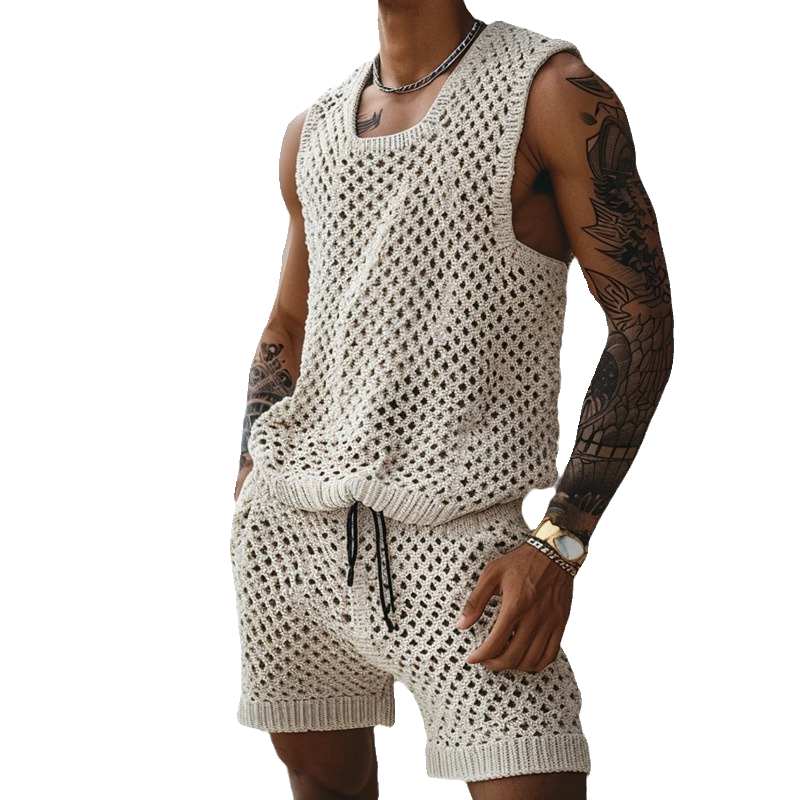 2026夏外贸新款 suit Men 休闲针织套装 男士 性感镂空背心五分短裤