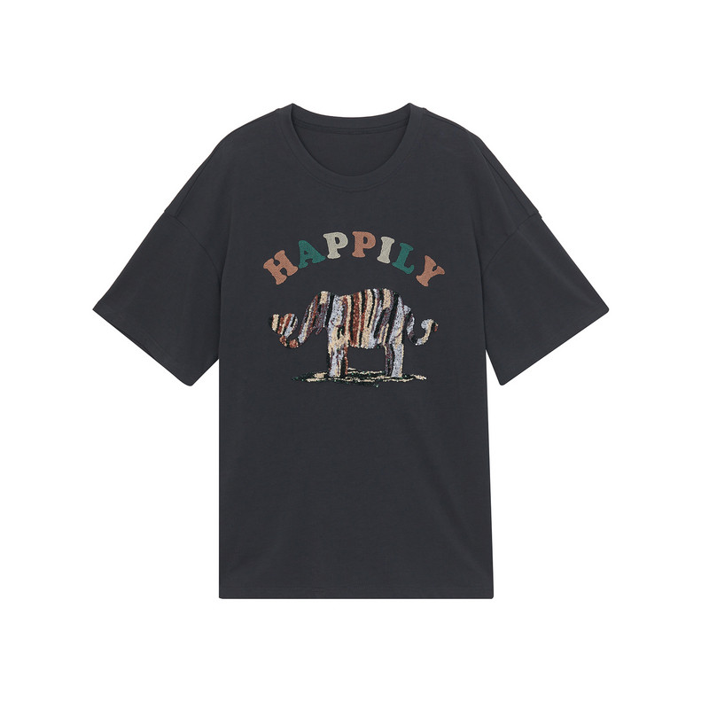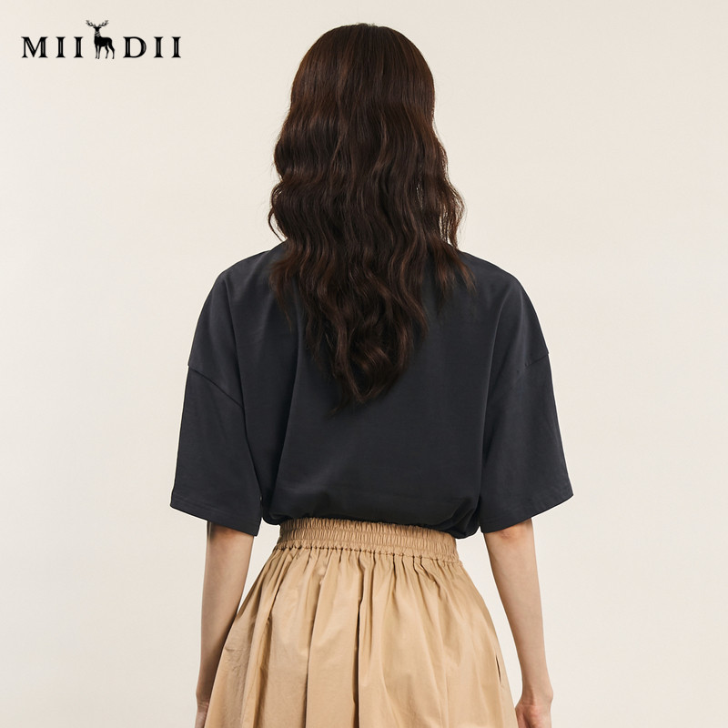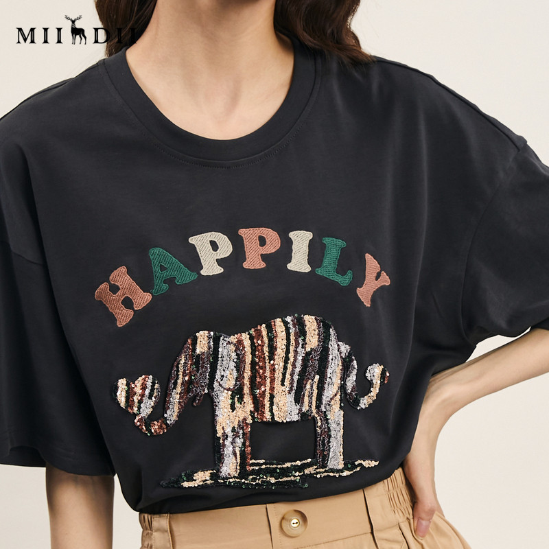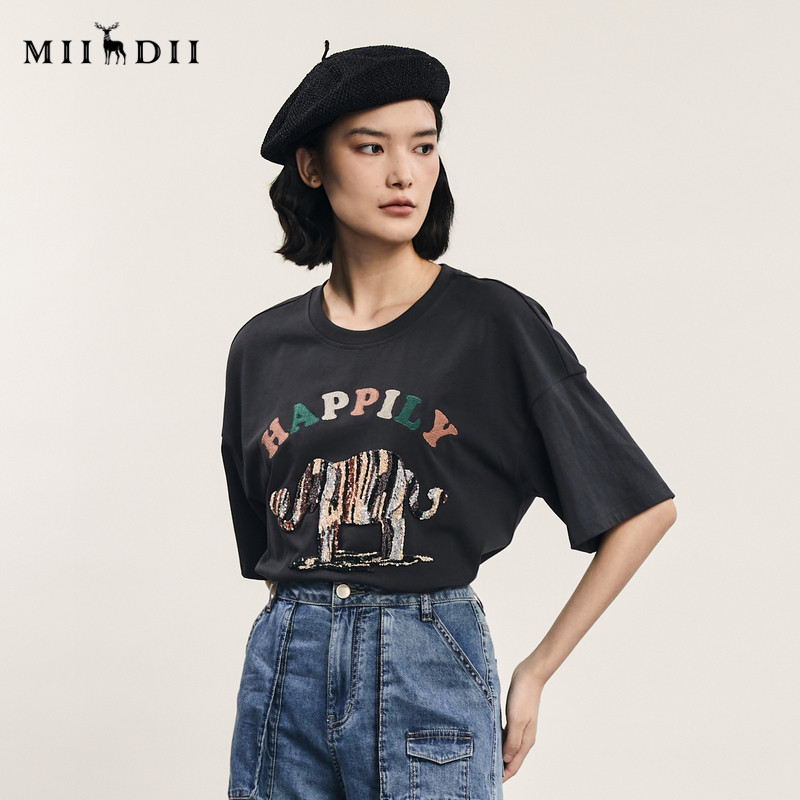 新款 趣味绣花圆领百搭上衣242MT0528 女年夏季 谜底宽松T恤短袖由