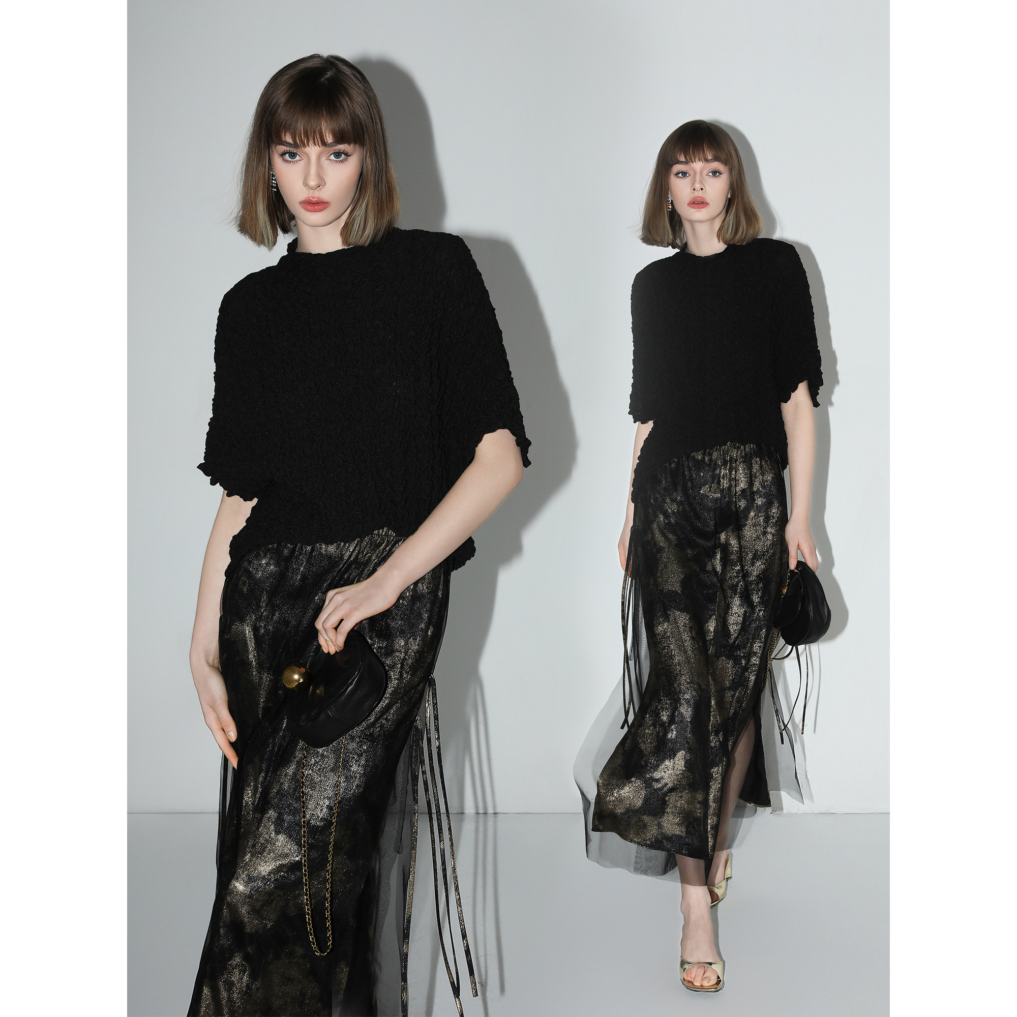 新中式 烫金网纱半身裙女开叉长裙HS0028 浮金碎影 COCOBELLA
