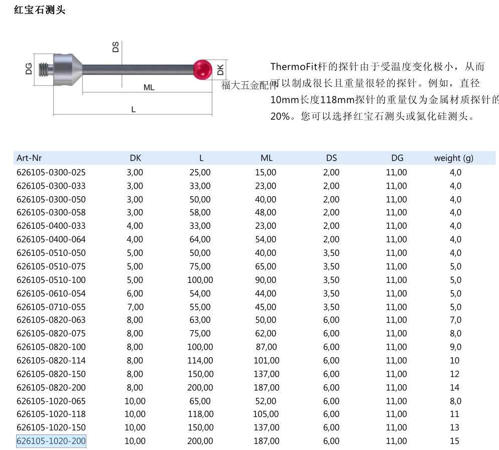 为您提供商品德国蔡司626105 200 Zeiss蔡司三坐标测针M5测头 10.0×200L 1020的详细介绍,