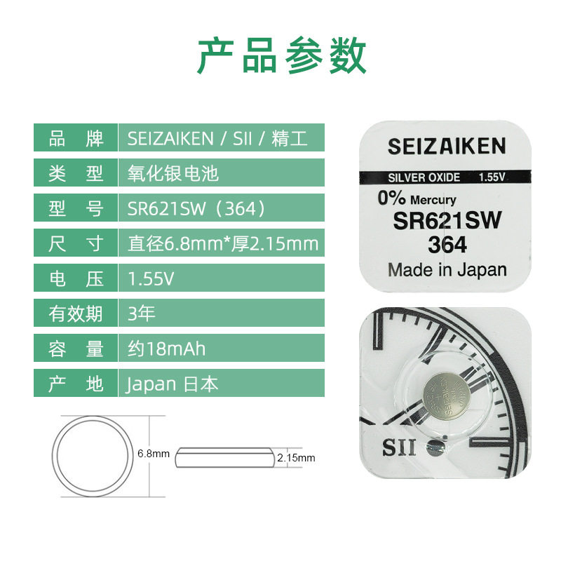 为您提供商品SR621SW 纽扣电池氧化银适用DW手表小颗粒电子 日本精工364 原装的详细介绍,