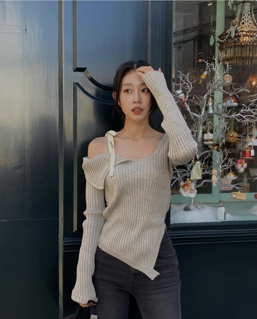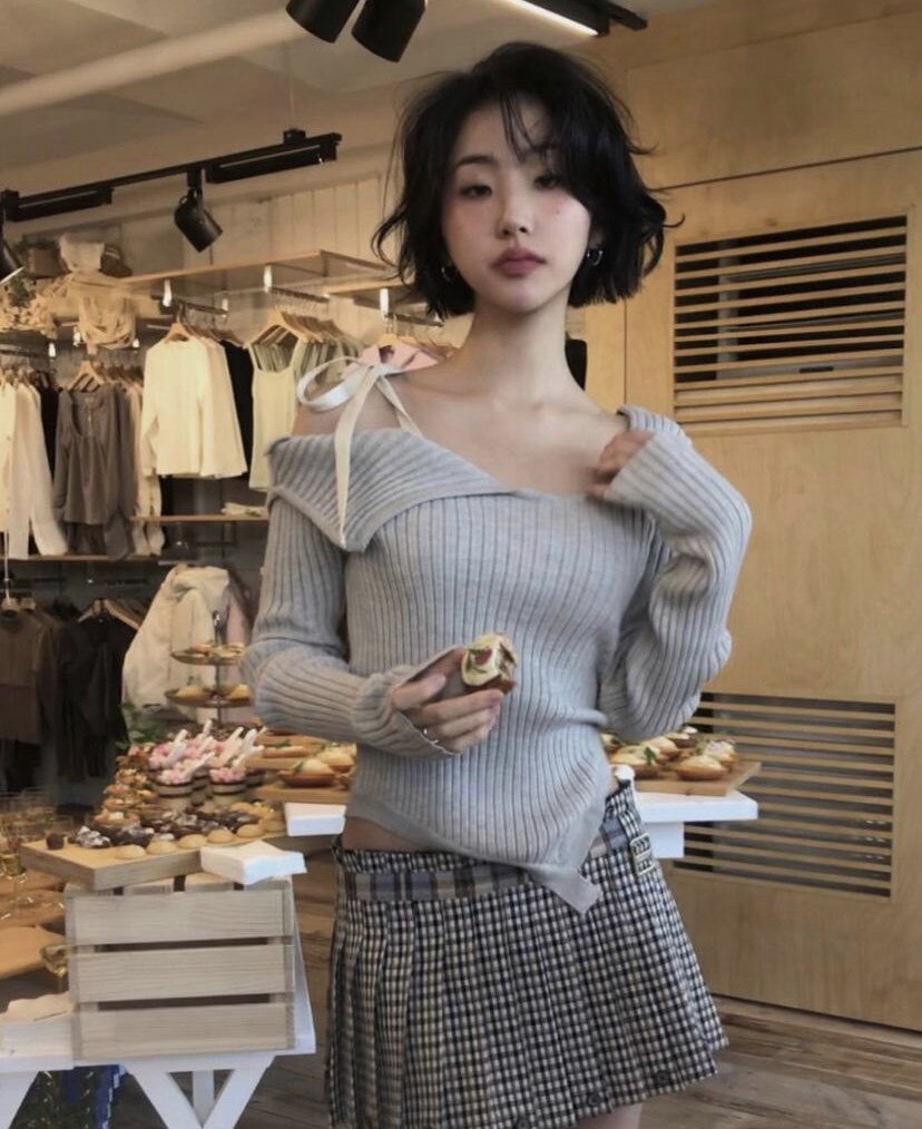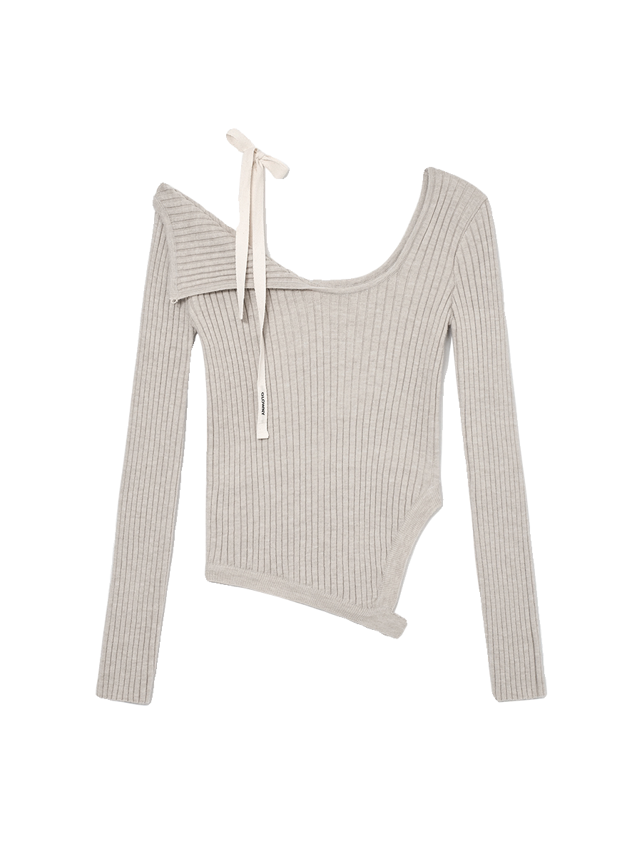 赵美延同款 针织衫 修身 打底 毛衣纯欲露肩系带蝴蝶结性感一字领长袖由