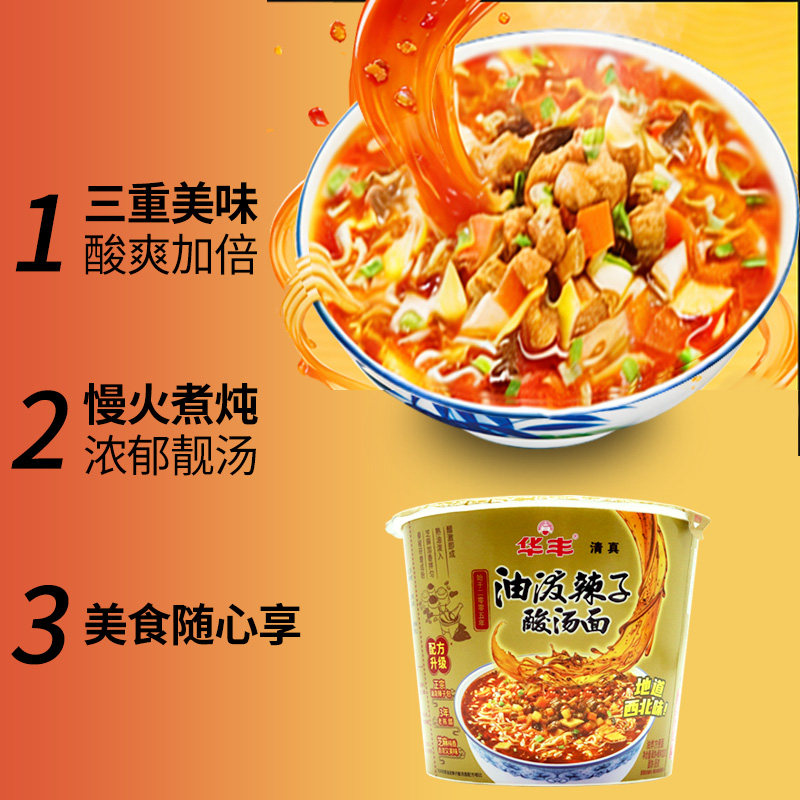 淘宝网为您提供商品华丰油泼辣子酸汤面桶装 12杯整箱批速即食品泡面清真方便面 120g的详细介绍,