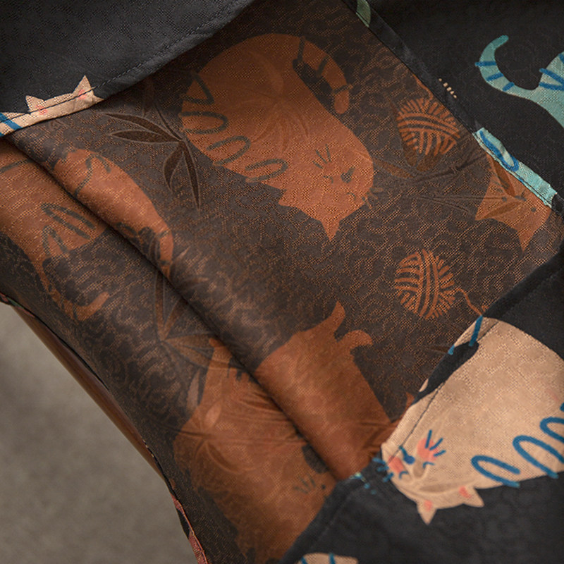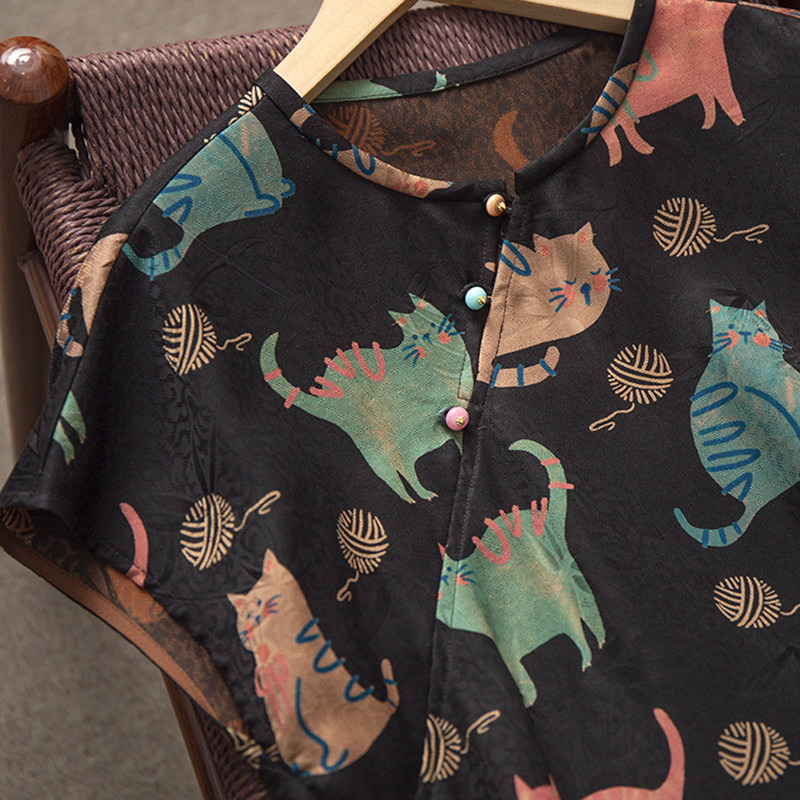 小衫 猫咪印花真丝香云纱花萝斜襟上衣女100%桑蚕丝提花短袖 丝艺
