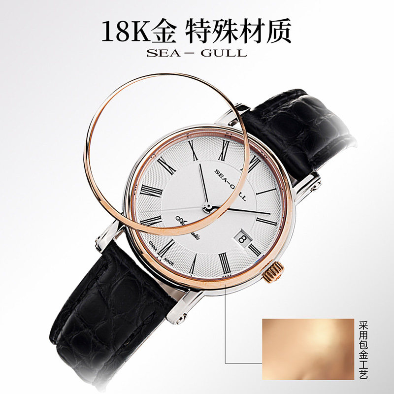 海鸥手表男女士情侣对表18K金简约休闲全自动机械表218.377L 正品由