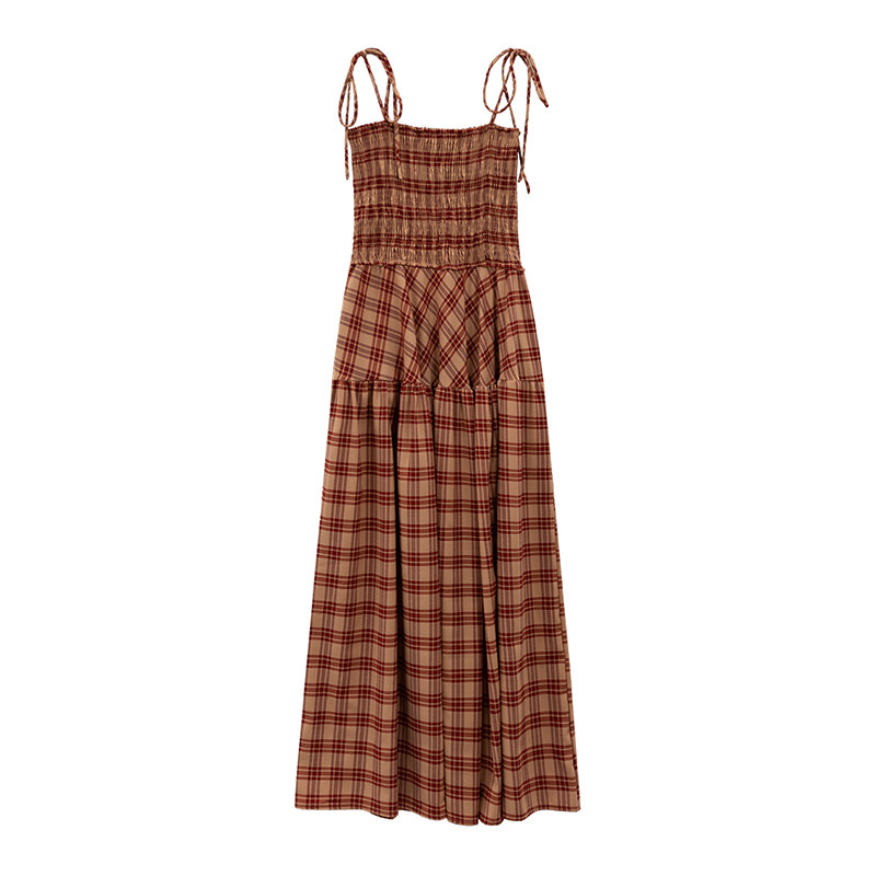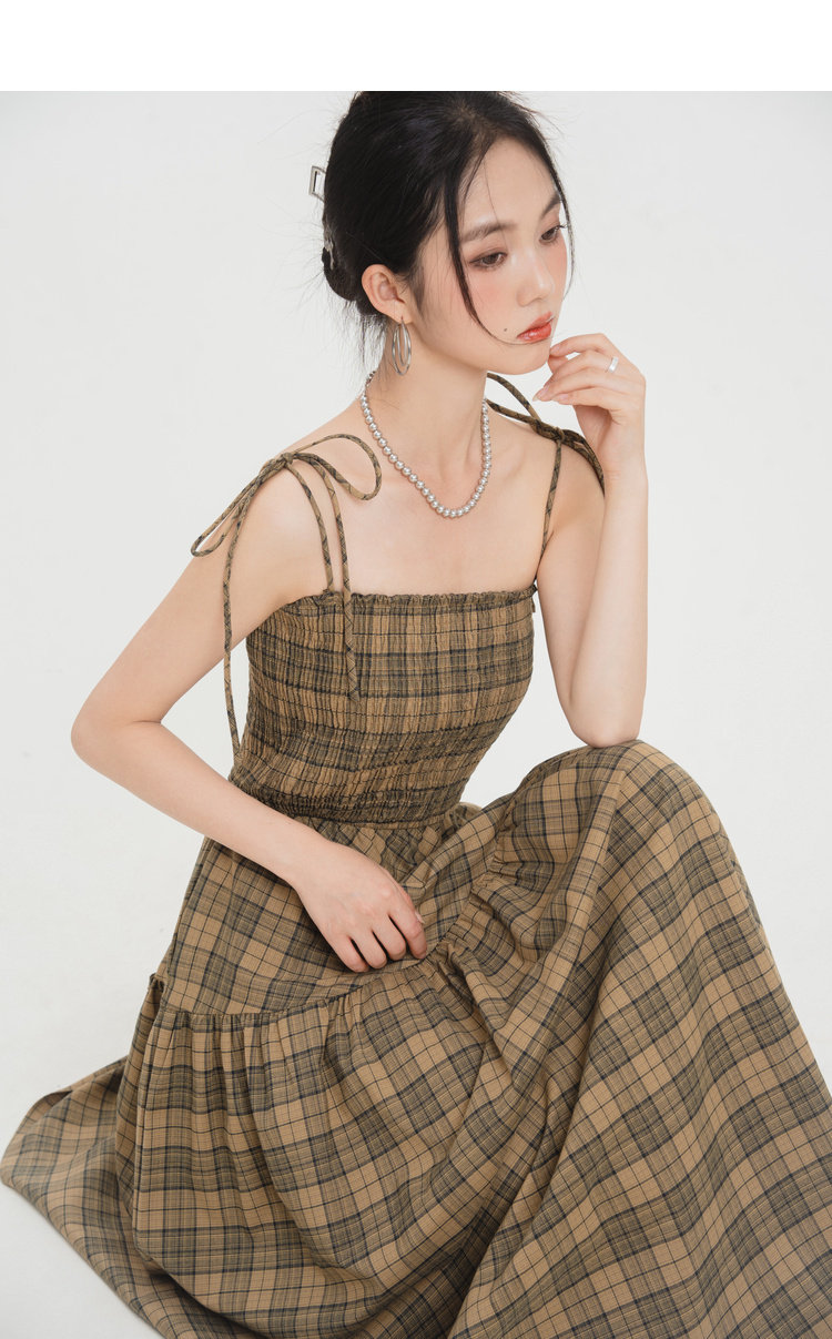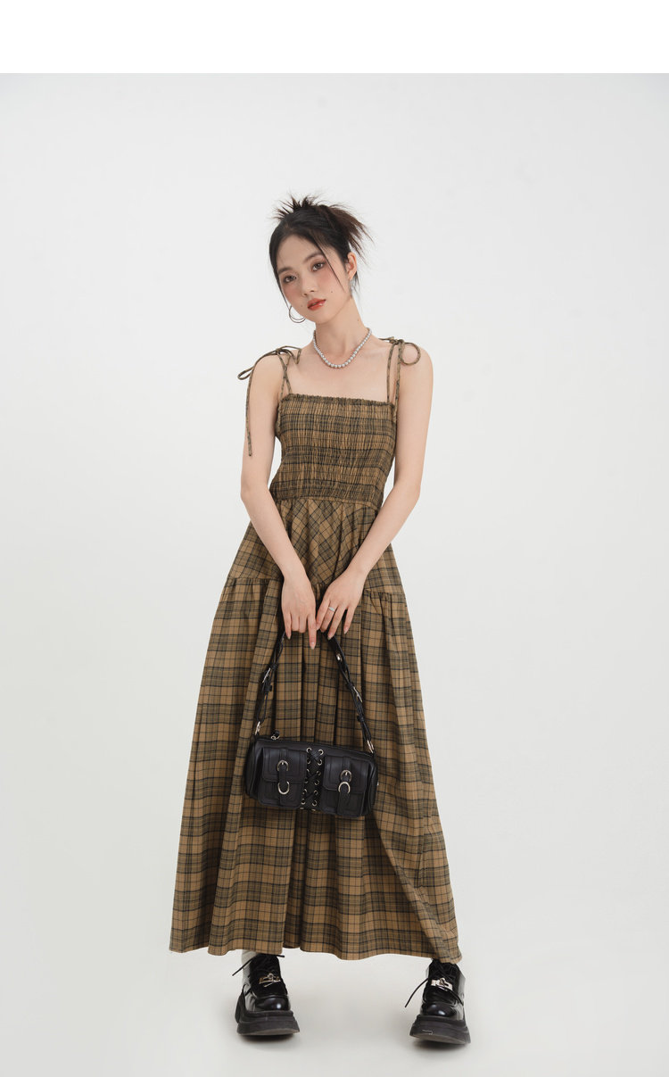 法式 2023新款 小众修身 打揽裙子 绑带格子长裙连衣裙女春季