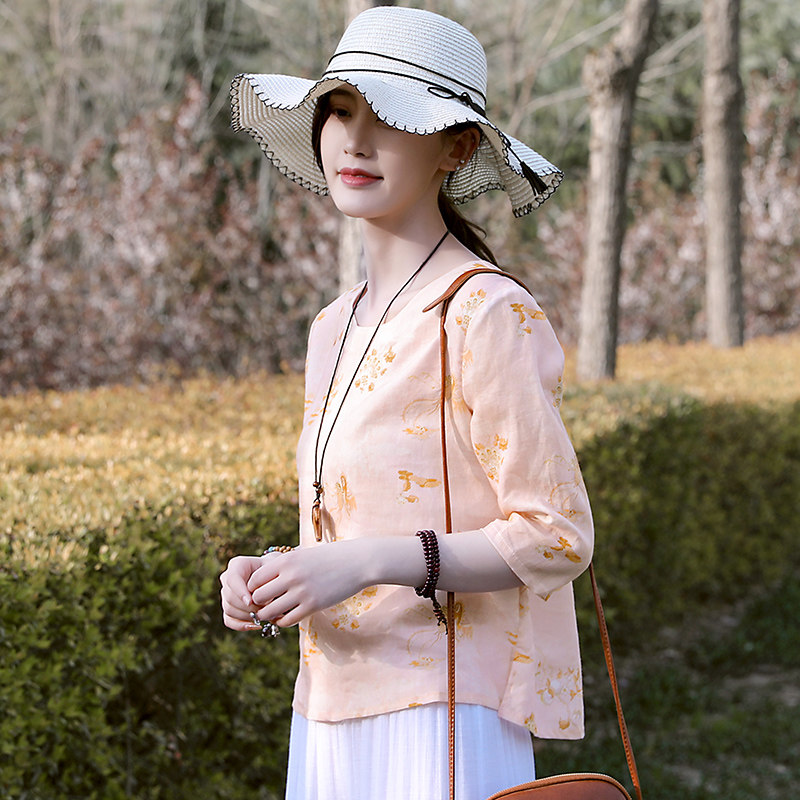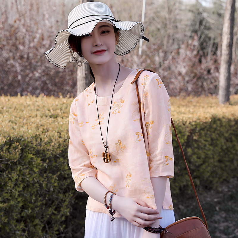 为您提供商品2021夏季 旅行文艺轻薄透气苎麻印花T恤女装 简约显瘦上衣小衫 新款的详细介绍,