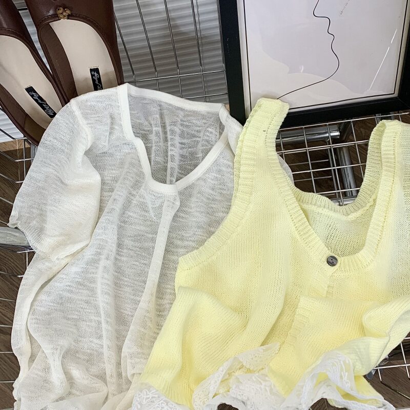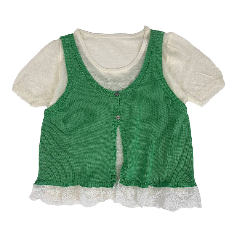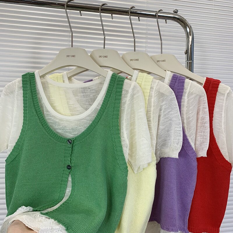 为您提供商品新款 韩系甜美薄款 叠穿短袖 T恤针织马甲背心女2025夏季 两件套 时尚的详细介绍,