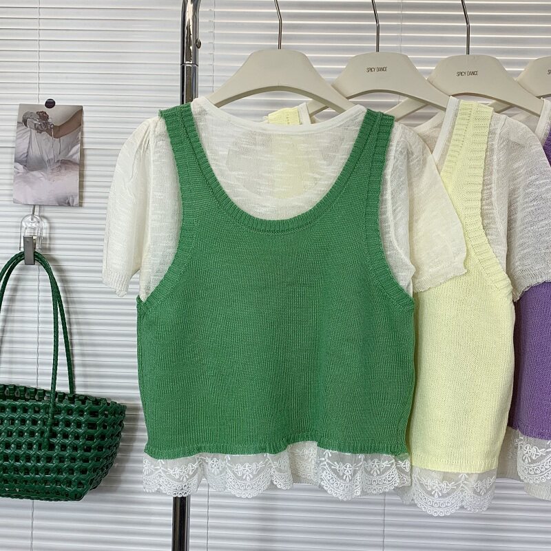 新款 韩系甜美薄款 叠穿短袖 T恤针织马甲背心女2025夏季 两件套 时尚由