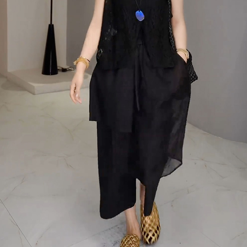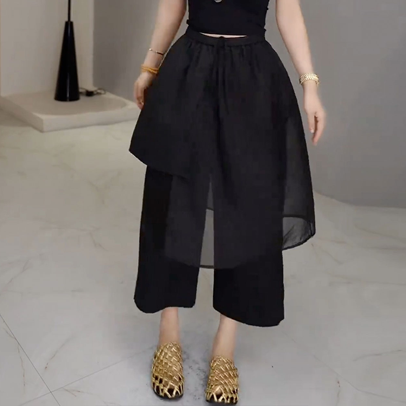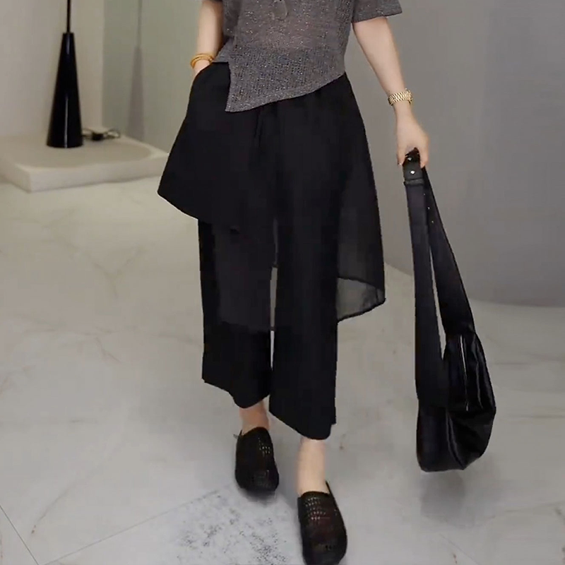 黑色网纱拼接屁帘休闲裤 大码 显瘦小个子通勤直筒山本裤 裙 女夏薄款由
