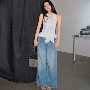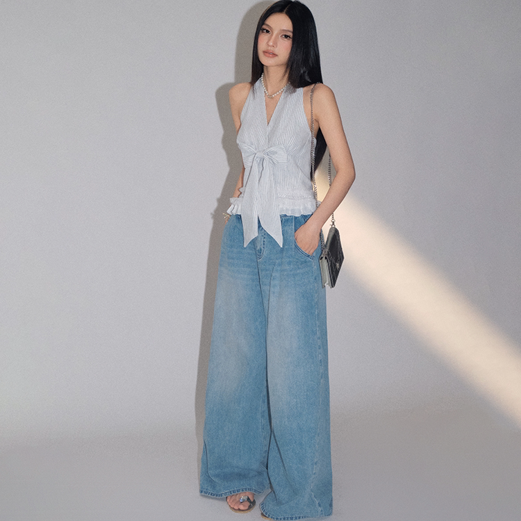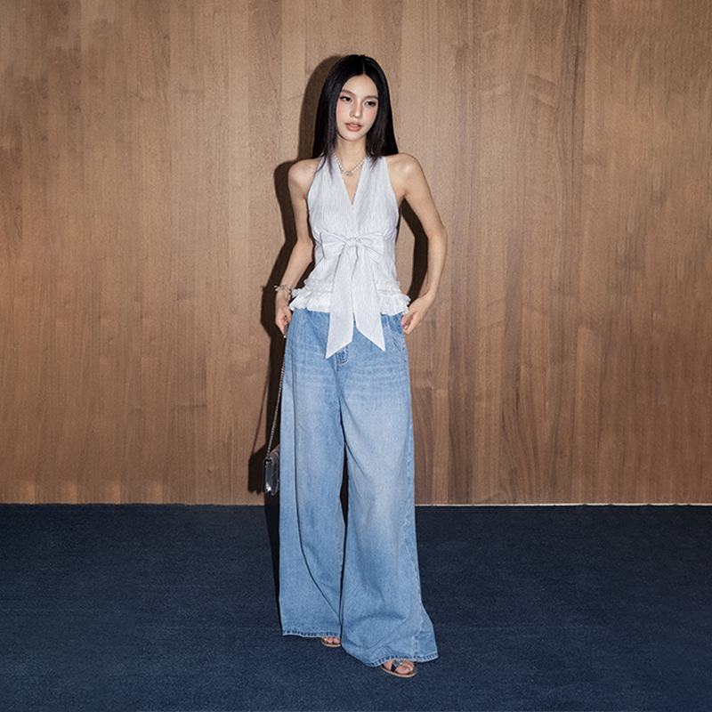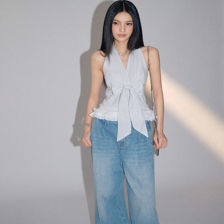 OLIVIA DUO蝴蝶结条纹v领挂脖吊带背心蕾丝下摆辣妹上衣 现货