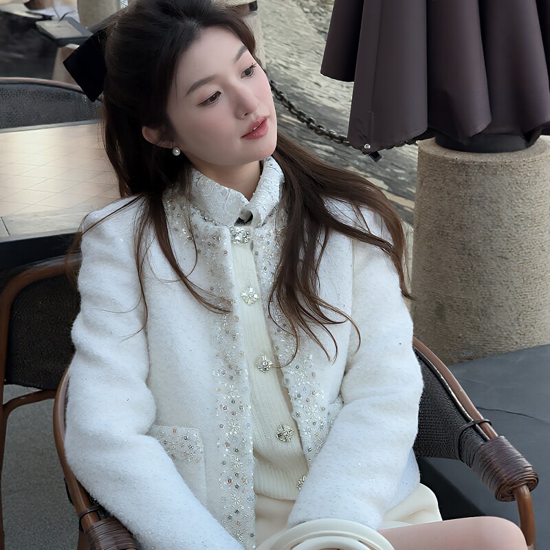 新款 重工亮片气质名媛小香风毛呢加棉短外套 圣妮思2026春季 SNSR由
