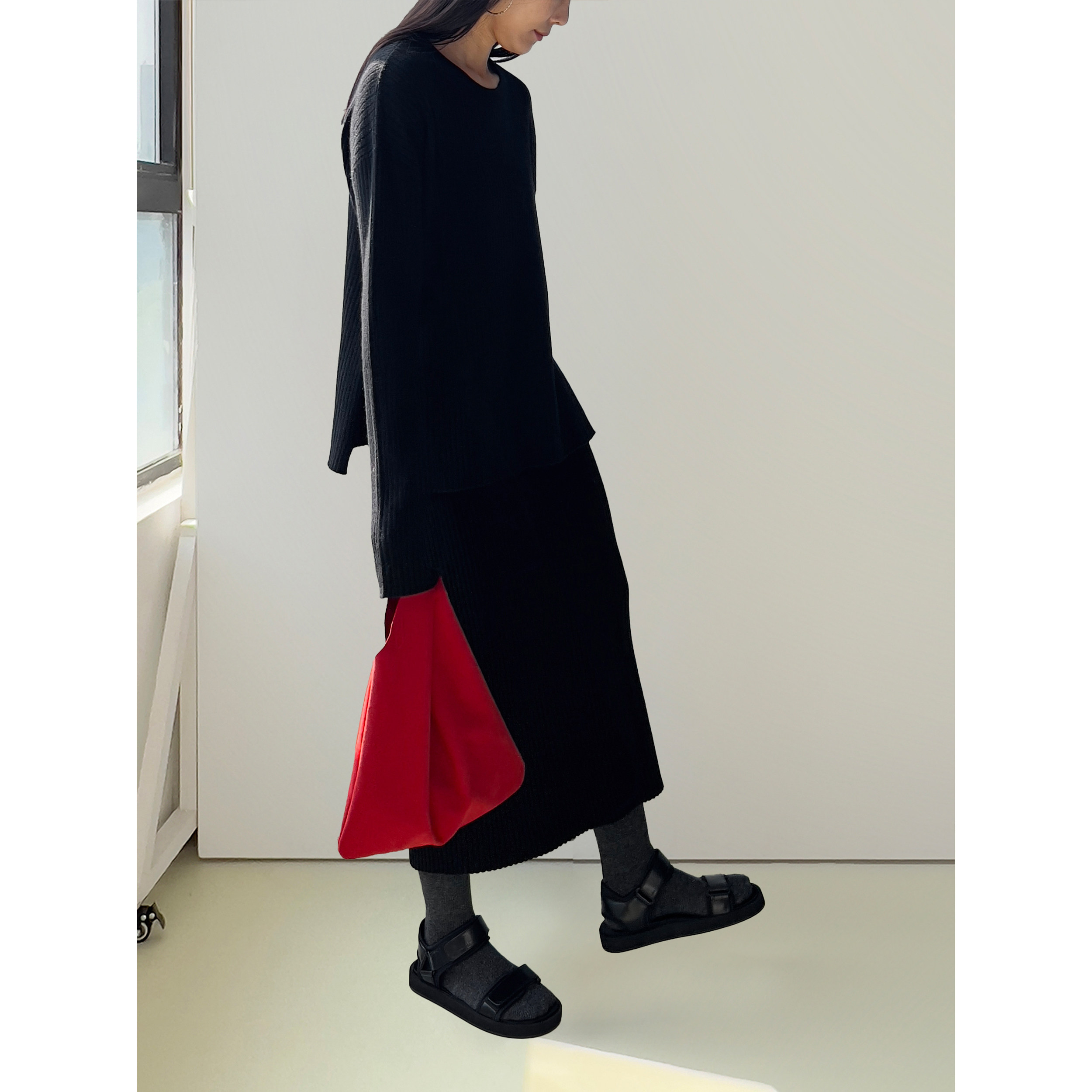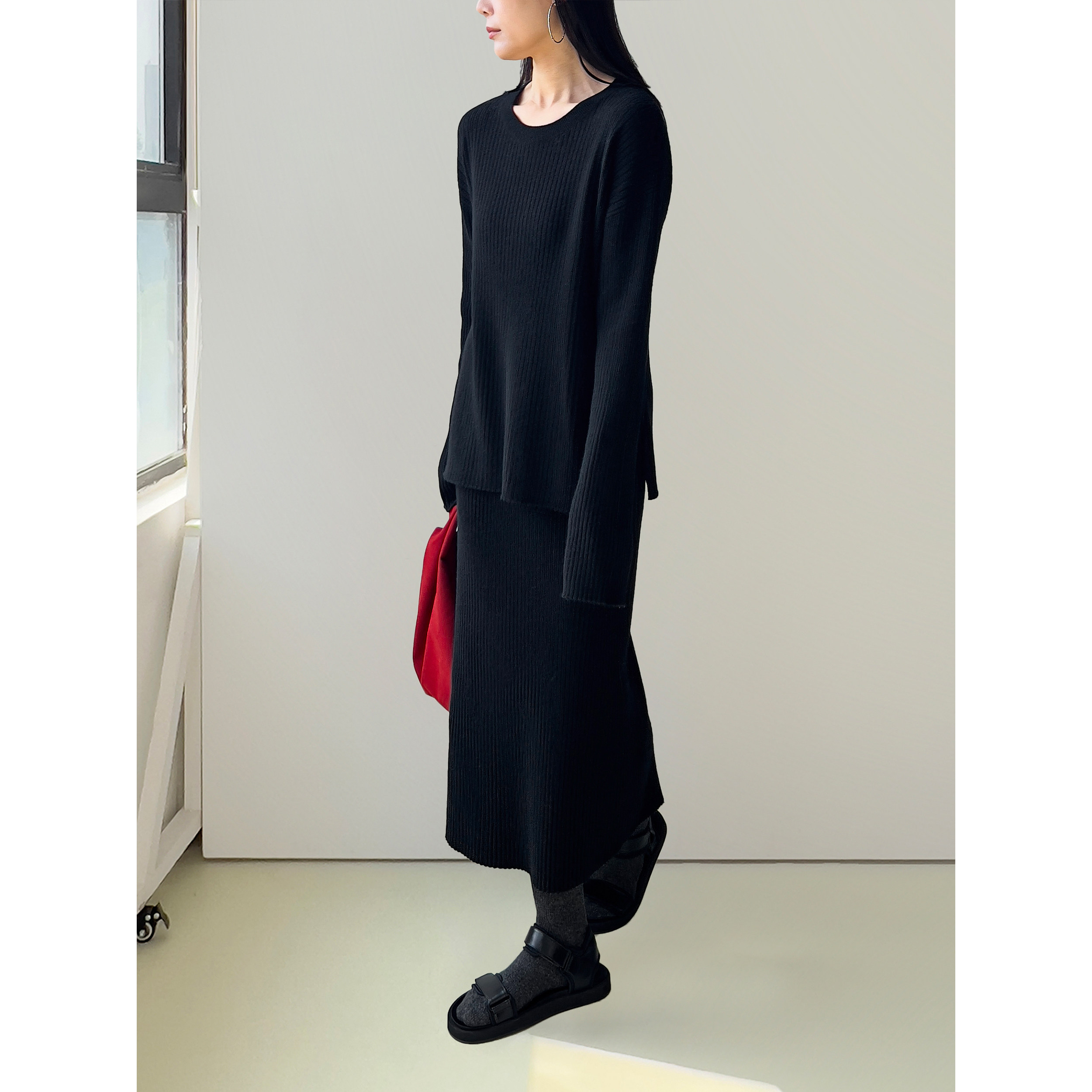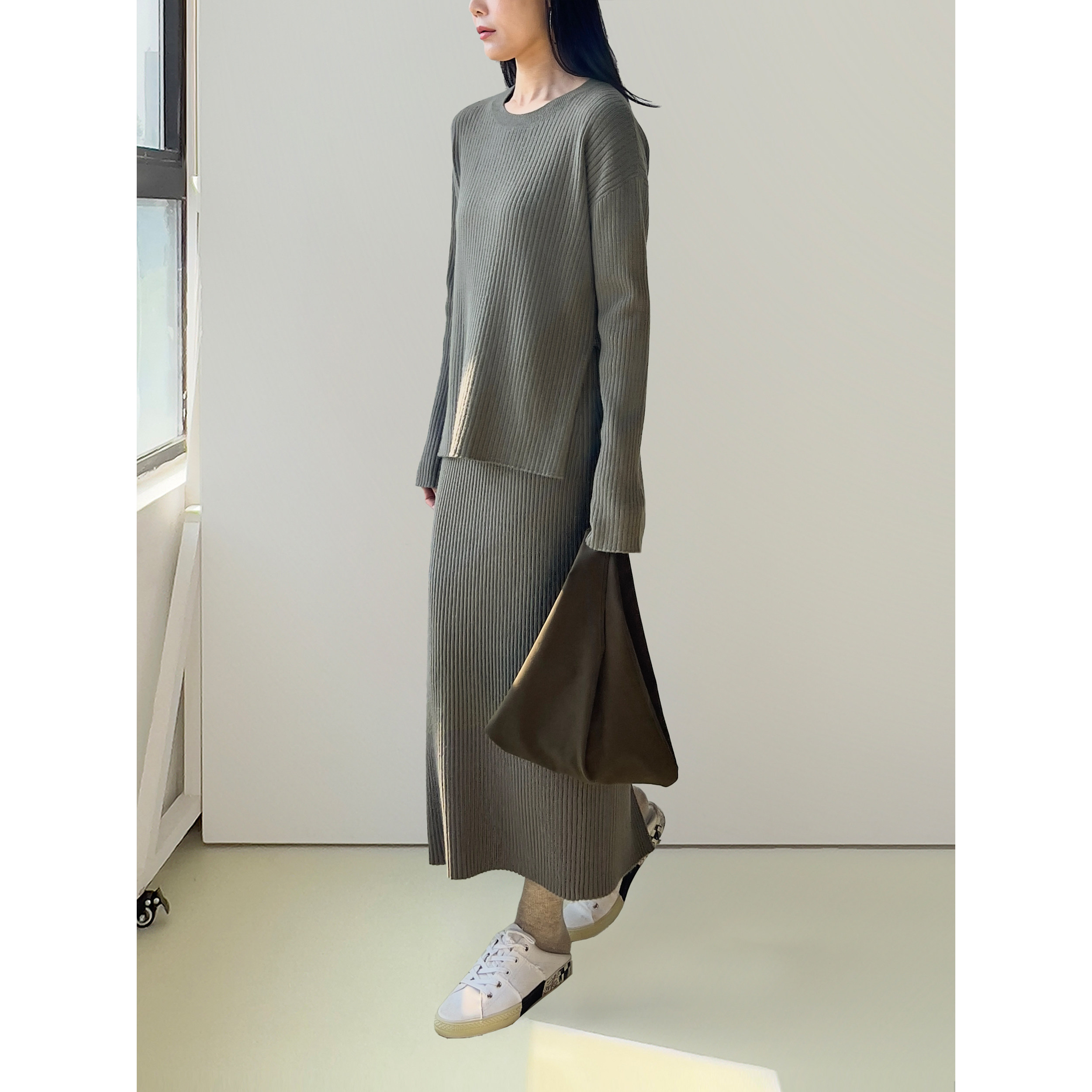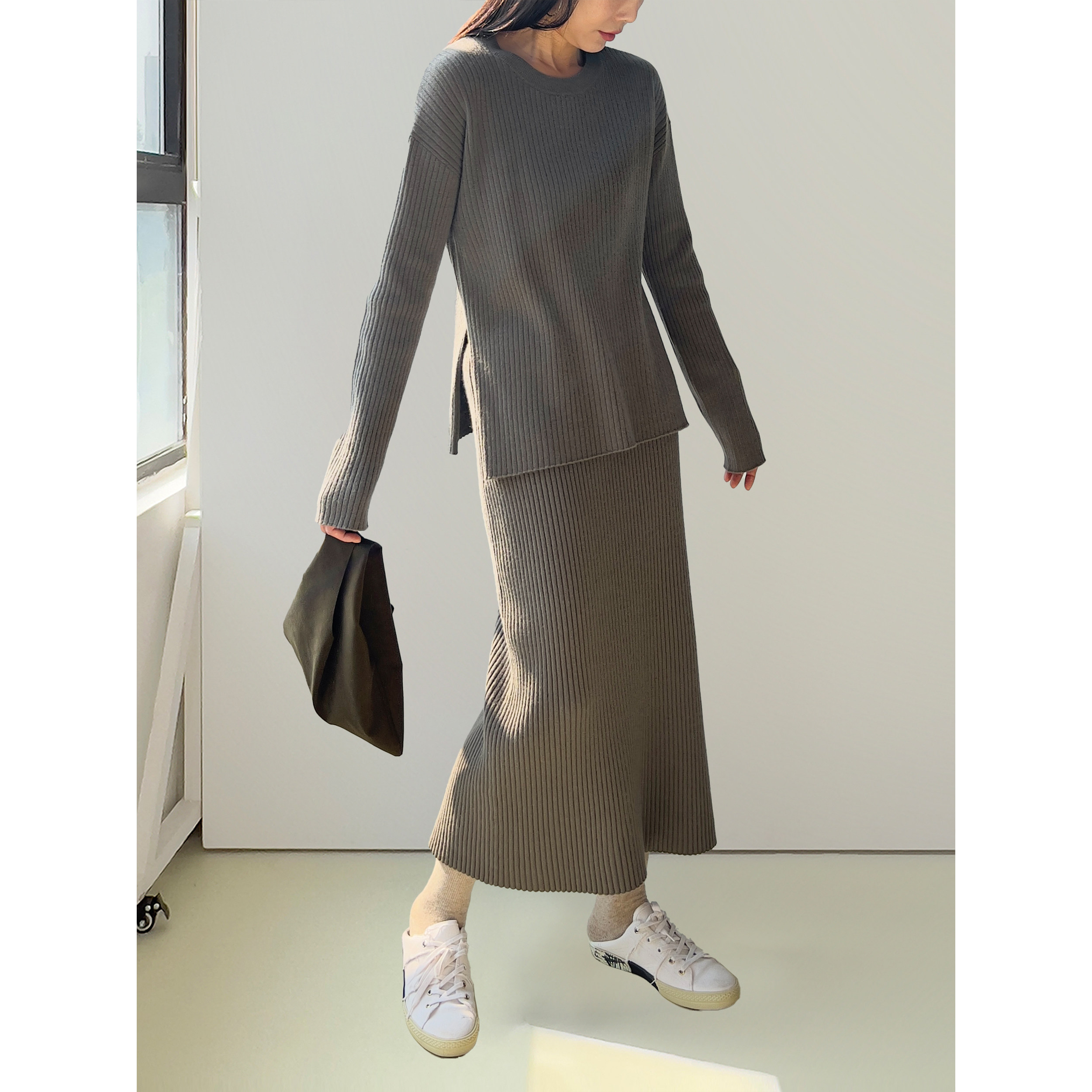 卡其 黑色羊毛针织圆领侧开衩毛衣 Sight Plain由