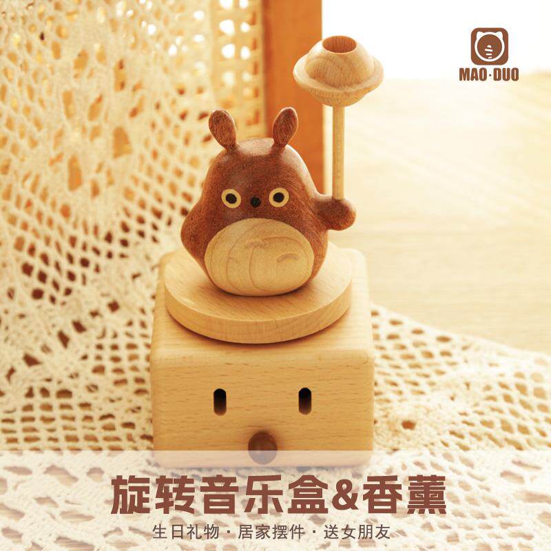 龙猫香薰桌面摆件实木高级感小众旋转八音盒办公桌书桌创意礼物由
