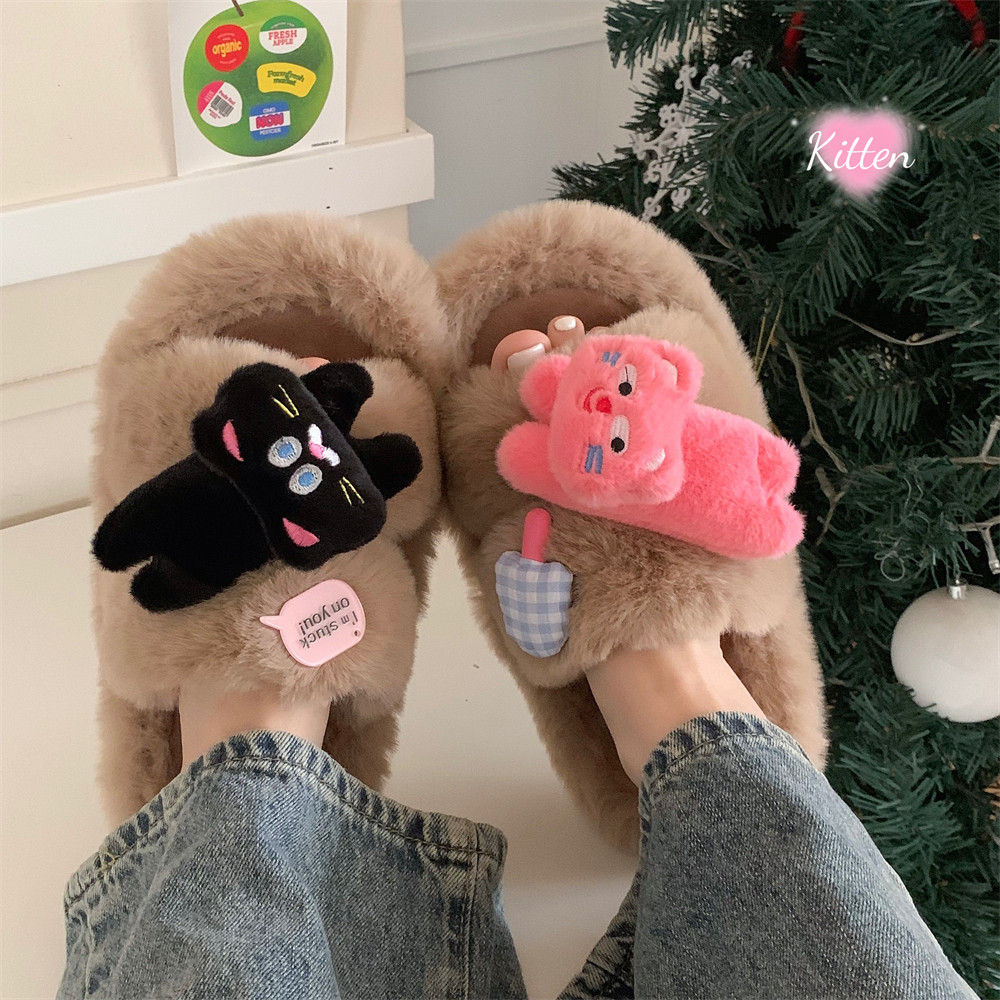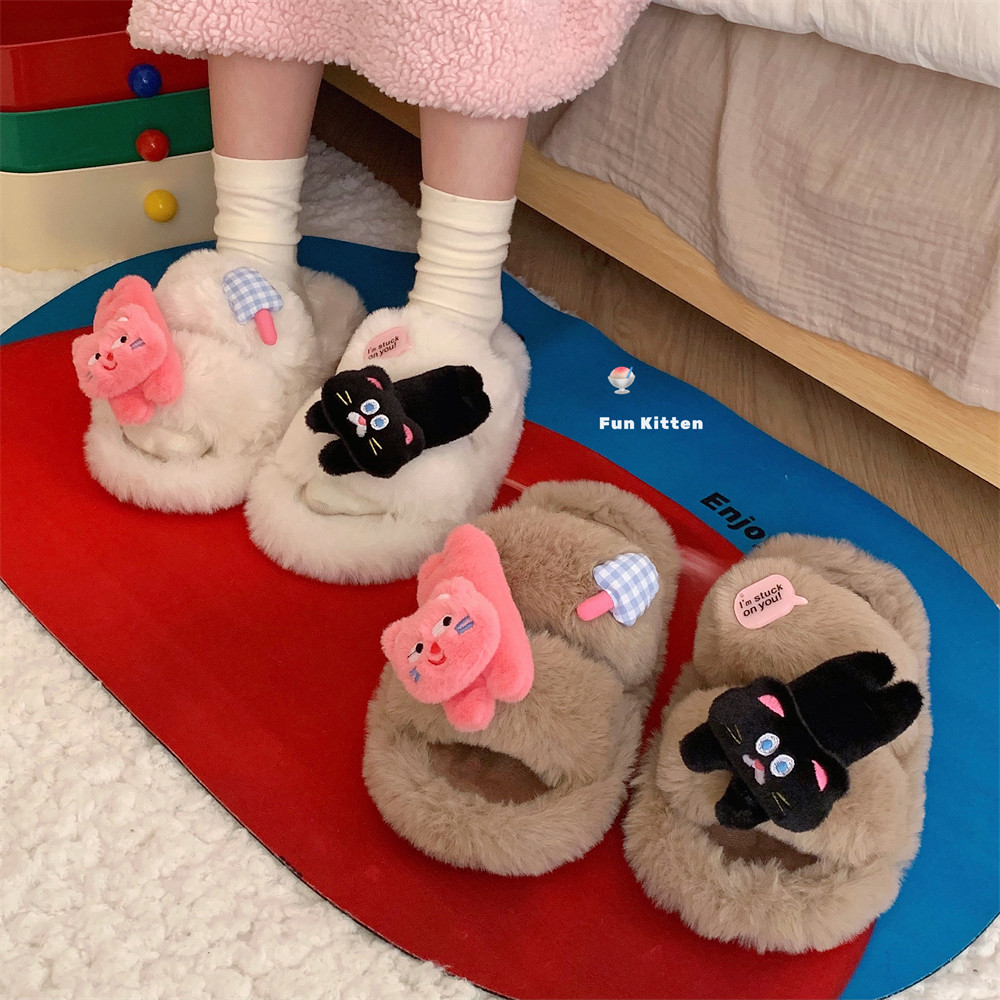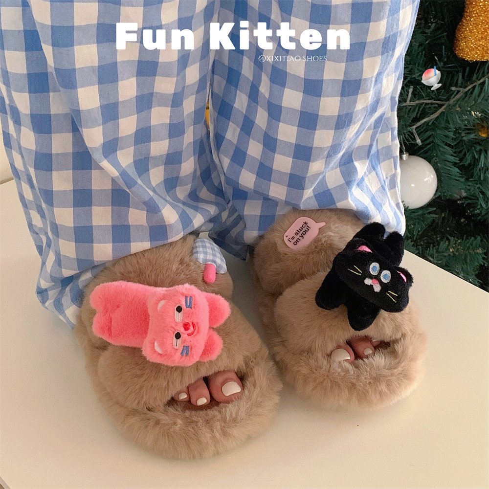 细细条 冬季 室内外穿ins趣味小猫爪居家棉拖鞋 女 厚底二字毛毛拖鞋