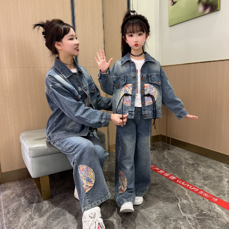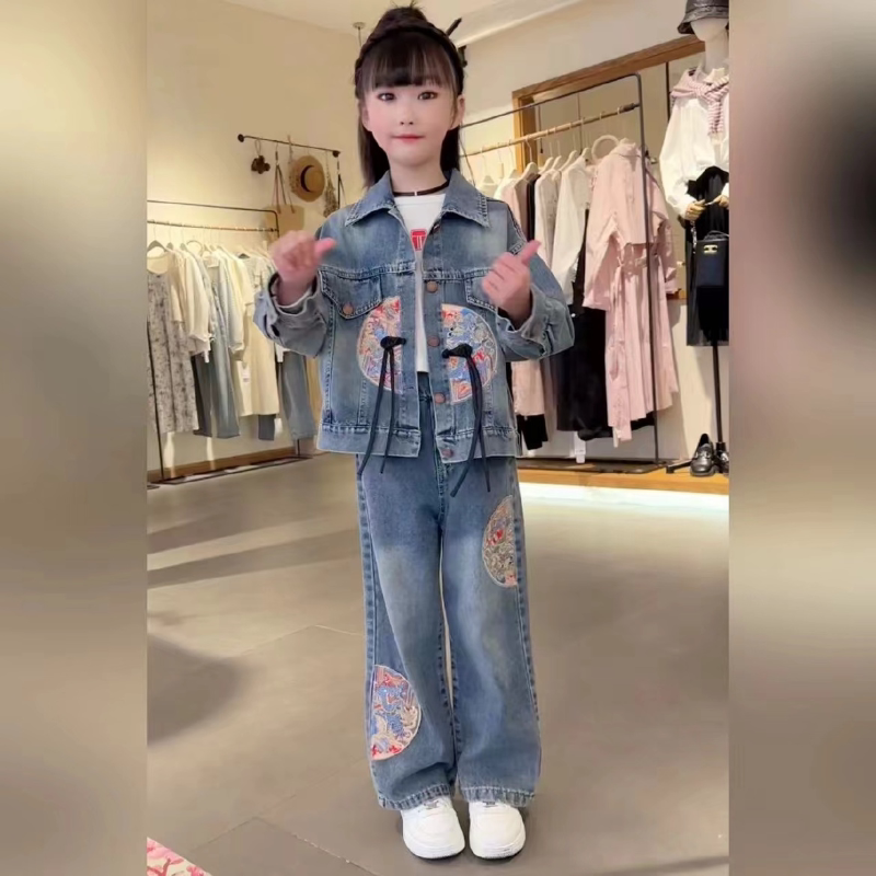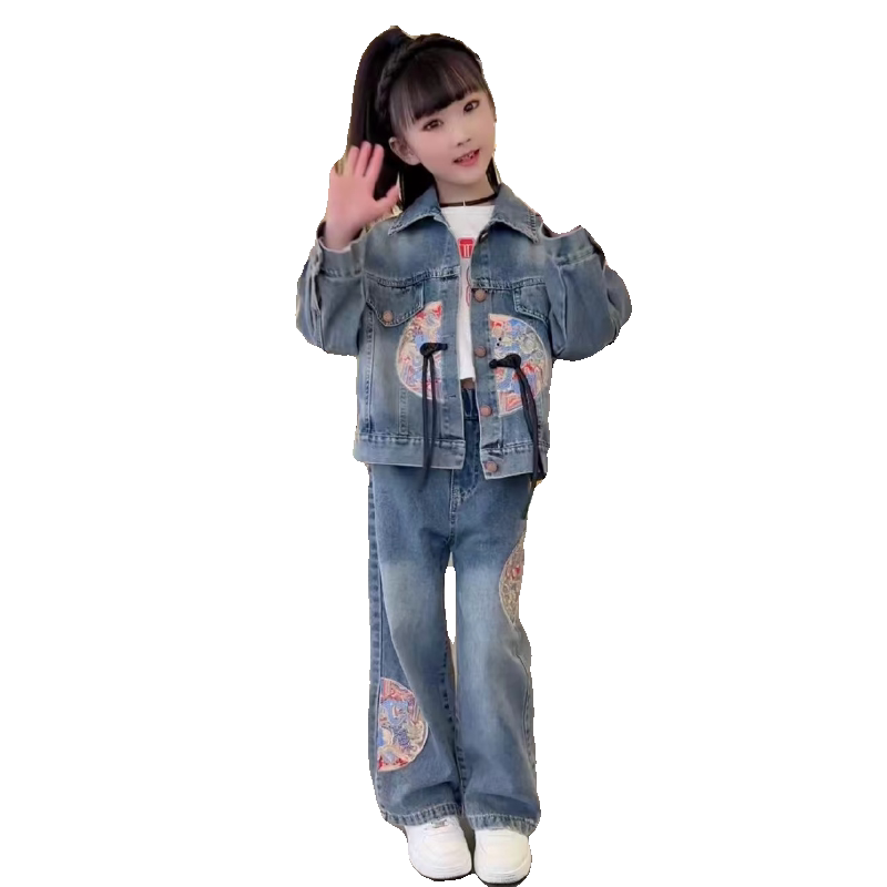 洋气重工刺绣辣妹潮酷穿搭儿童春装 两件套 春季 女童国潮风牛仔套装